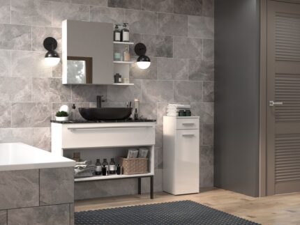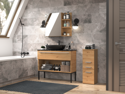 Zestaw mebli łazienkowych VAMI to kwintesencja nowoczesnego stylu. Dzięki otwartym półkom, szafki są lekkie wizualnie i perfekcyjnie wpisują się w najnowsze