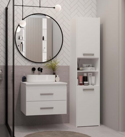 Słupek regał łazienkowy FIN 2D 1SZ 1W to elegancki i funkcjonalny mebel, w którym przechowywać można ręczniki, kosmetyki oraz inne