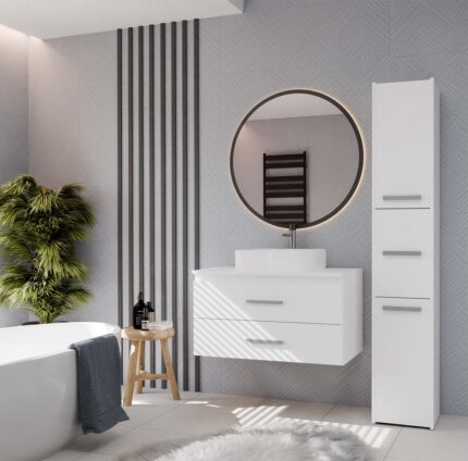 Zestaw mebli łazienkowych VAMI to kwintesencja nowoczesnego stylu. Dzięki otwartym półkom, szafki są lekkie wizualnie i perfekcyjnie wpisują się w najnowsze