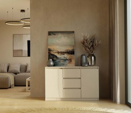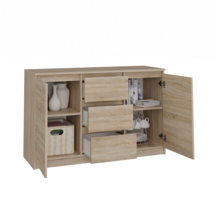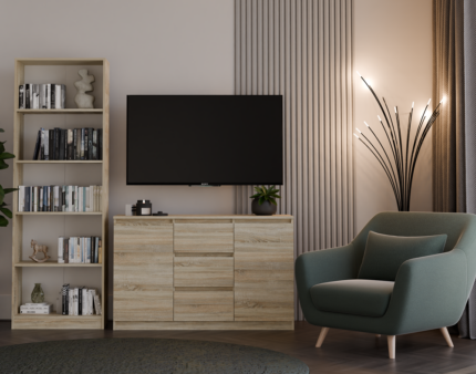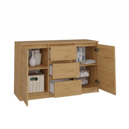 Szafka została wykonana z wysokogatunkowej płyty laminowanej odpornej na ścieranie. Obrzeża krawędzi zabezpieczono poprzez wykorzystanie okleiny typu ABS. Zastosowanie dwóch