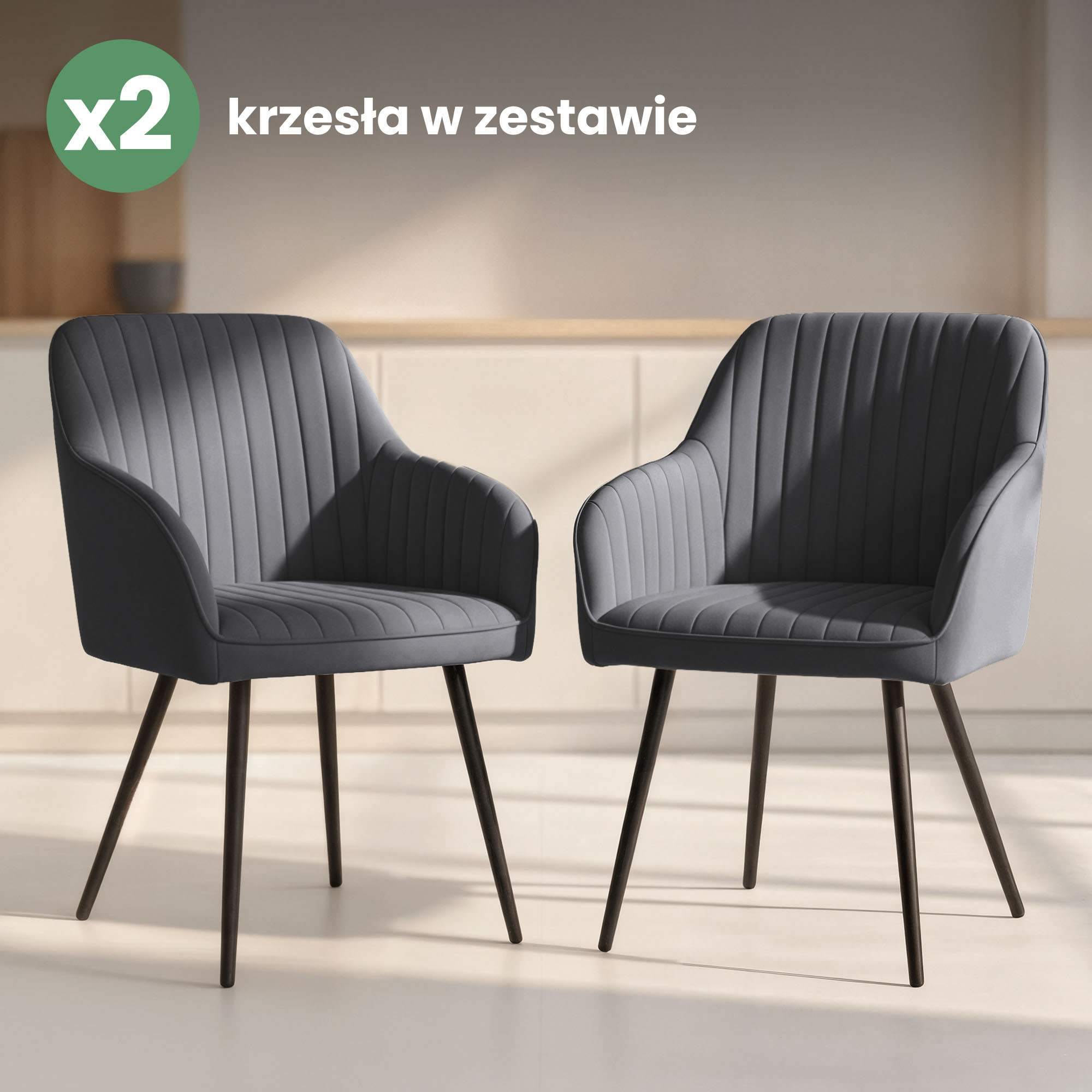 2x Welurowe krzesło tapicerowane z przeszyciami Ciemny Grafit FLORENCE Czarne nogi