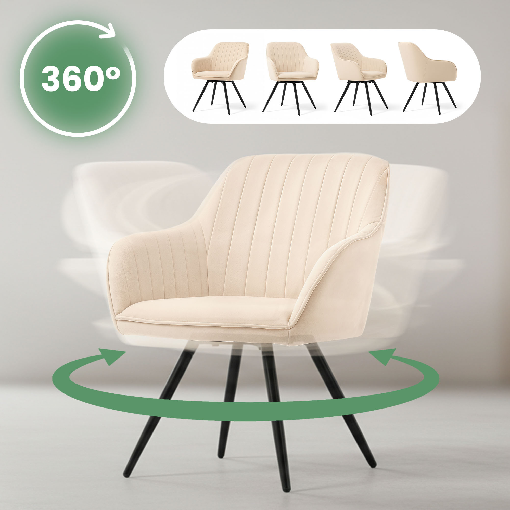 6x Welurowe krzesło obrotowe z przeszyciami Beżowe TURNO Czarne nogi
