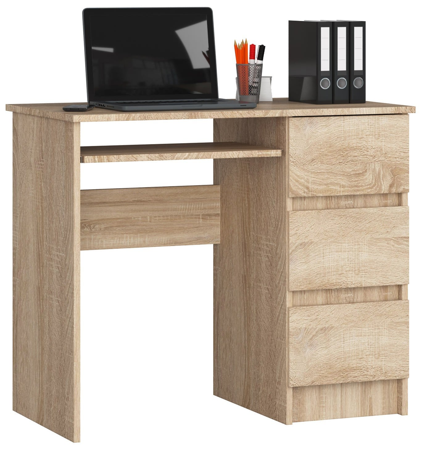 Prezentowane biurko komputerowe A-6 SONOMA PRAWE to idealne rozwiązanie dla osób, które cenią sobie funkcjonalność, a jednocześnie nie chcą, aby mebel był zbyt dużych rozmiarów. Jego wymiary to: 90 cm długości, 77 cm wysokości i 50 cm głębokości. Biurko zostało wykonane z wysokiej jakości płyty laminowanej, która odporna jest na ścieranie. Z kolei widoczne krawędzie oklejone zostały obrzeżem ABS, co gwarantuje wyższą odporność na uszkodzenia. Mebel cechuje się więc dużą trwałością. Jego zaletą jest również funkcjonalność. Biurko posiada trzy szuflady i półkę pod klawiaturę, która porusza się na metalowych prowadnicach rolkowych. Wewnątrz każdych drzwiczek znajduje się jednak półka. W efekcie użytkownik posiada wiele wolnej przestrzeni do dowolnego zagospodarowania.