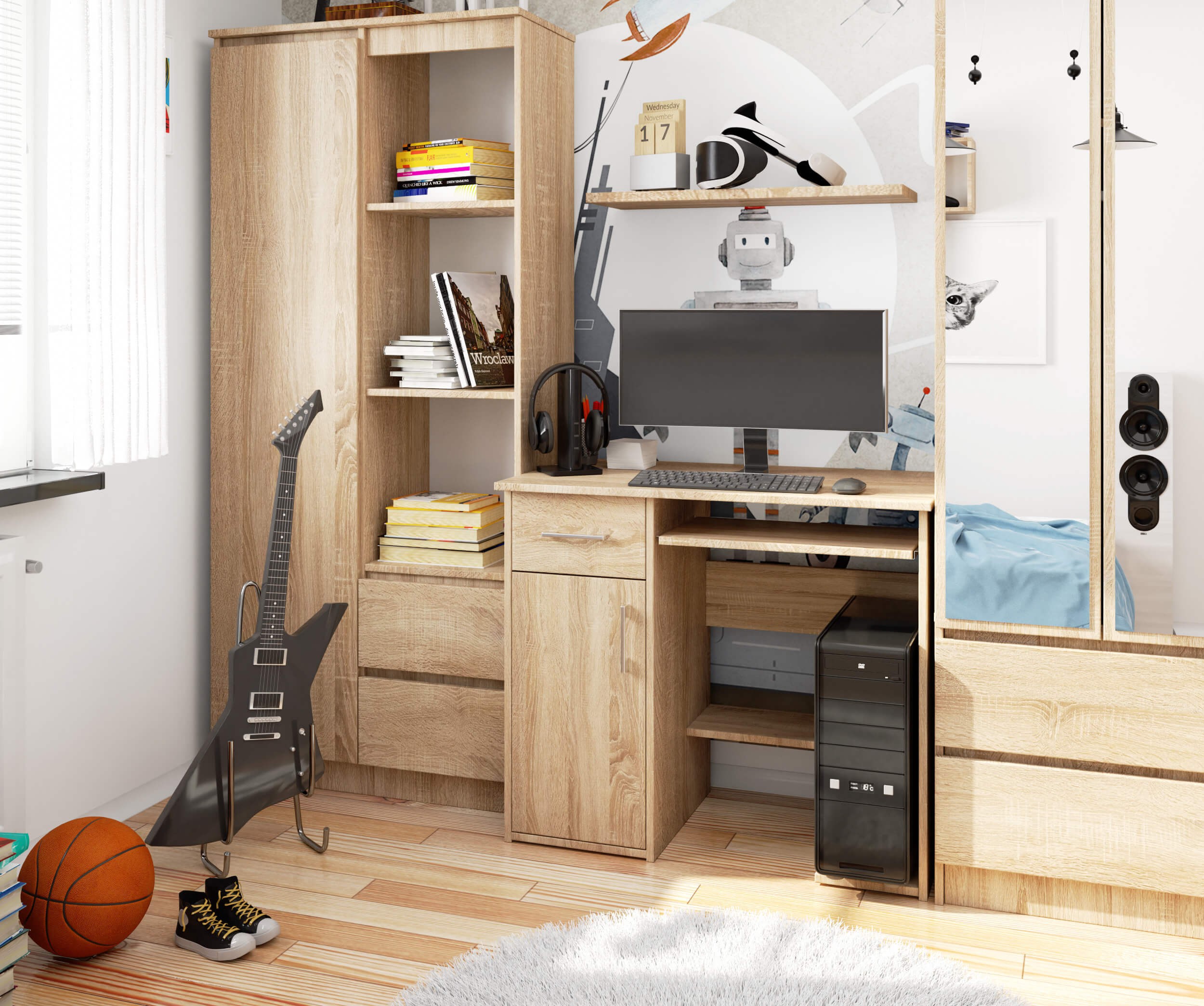 Kolor dąb sonoma nieustannie cieszy się ogromną popularnością. Dlaczego? Przede wszystkim dlatego, że jest to kolor bardzo uniwersalny. Świetnie łączy się z innymi barwami, pasuje do wnętrz zaprojektowanych w tradycyjny sposób, jak i urządzonych nowocześnie. Dodatkowo nie widać na nim brudu, co również jest jego niewątpliwym atutem. Biurko w kolorze dąb sonoma dedykowane jest zarówno osobom urządzającym biuro, jak i klientom, którzy szukają mebli do domowego gabinetu.