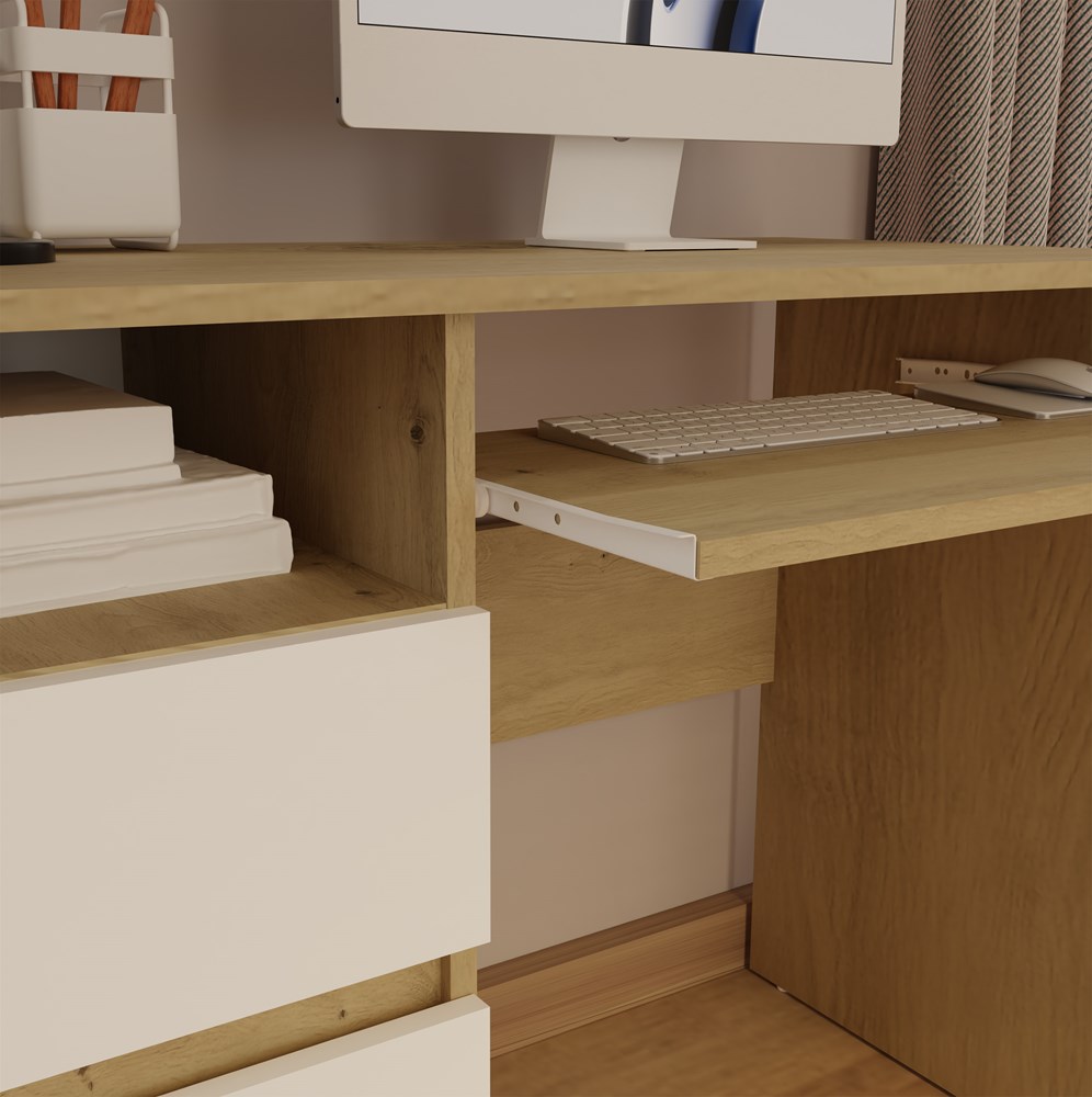 Dzięki swojej praktycznej konstrukcji i eleganckiemu wyglądowi, biurko stanowi doskonałą bazę do codziennej pracy. Sprawdzi się zarówno w przestronnych gabinetach, jak i w niewielkich pomieszczeniach, gdzie liczy się optymalizacja przestrzeni.