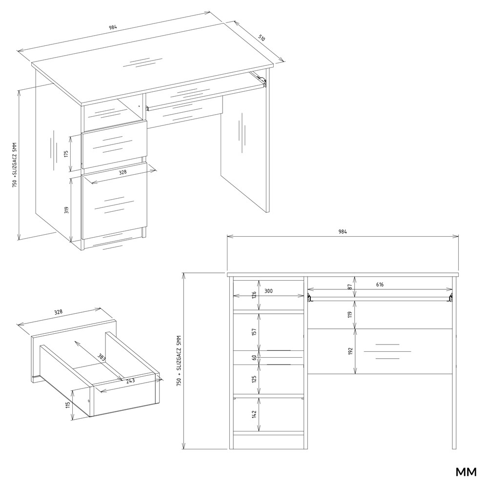 BIURKO Z SZUFLADĄ, SZAFKĄ I PÓŁKĄ NA KLAWIATURĘ