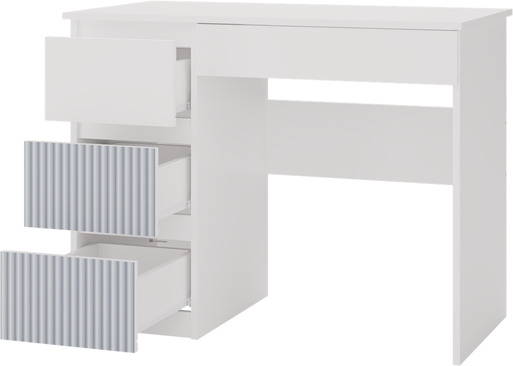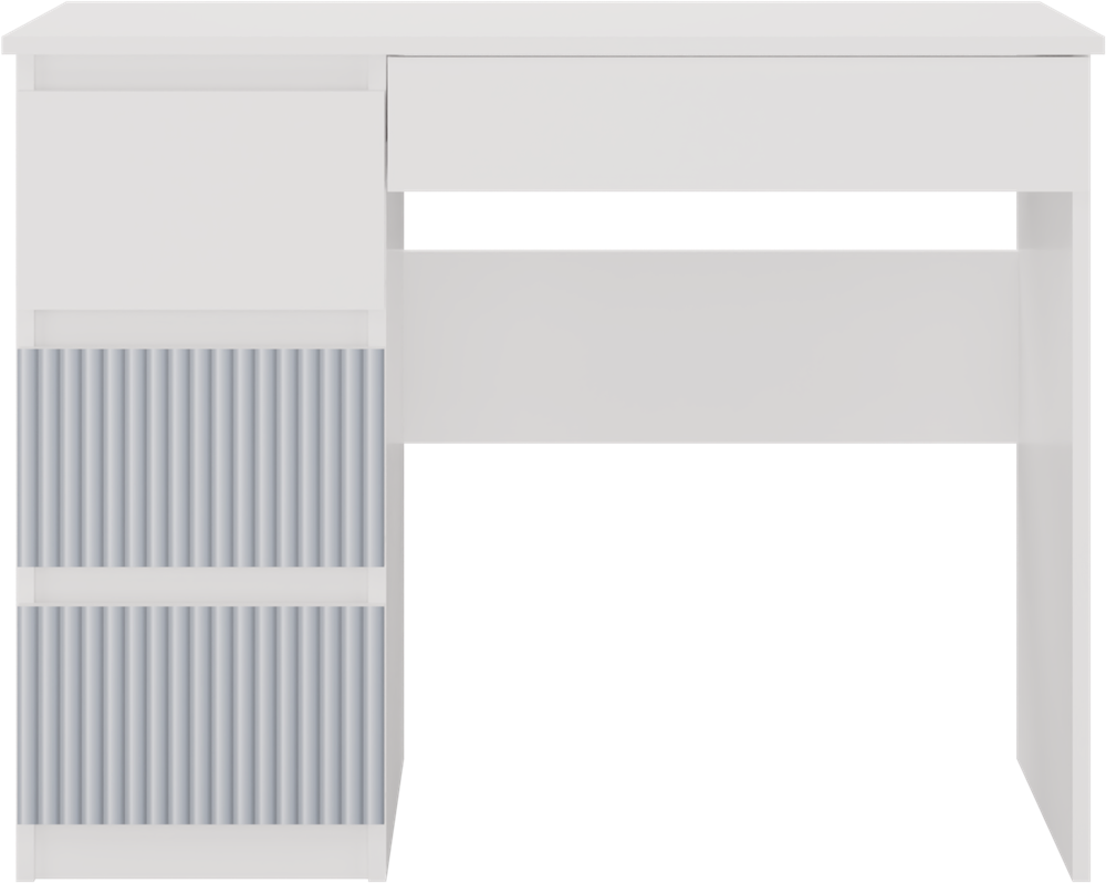 - 3 pojemne wysokie szuflady z lewej strony (w tym 2 szuflady z niebieskimi wzorami) i 1 niska z prawej strony pod blatem