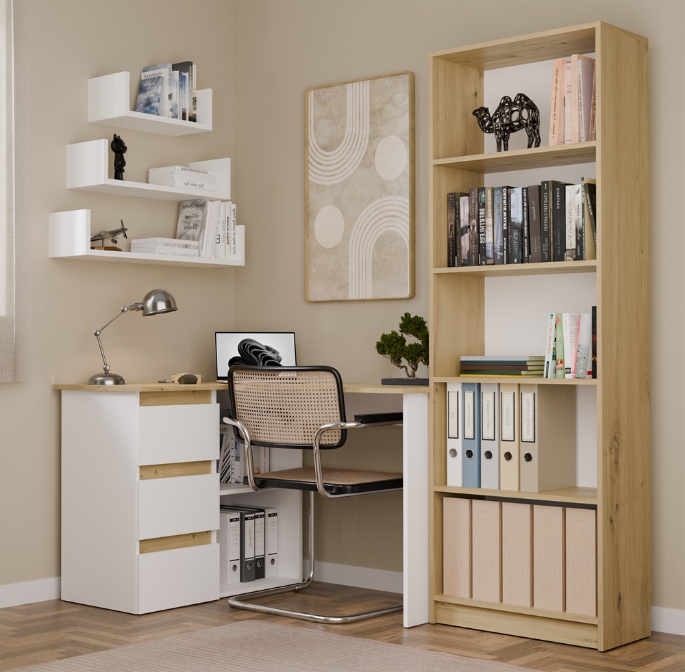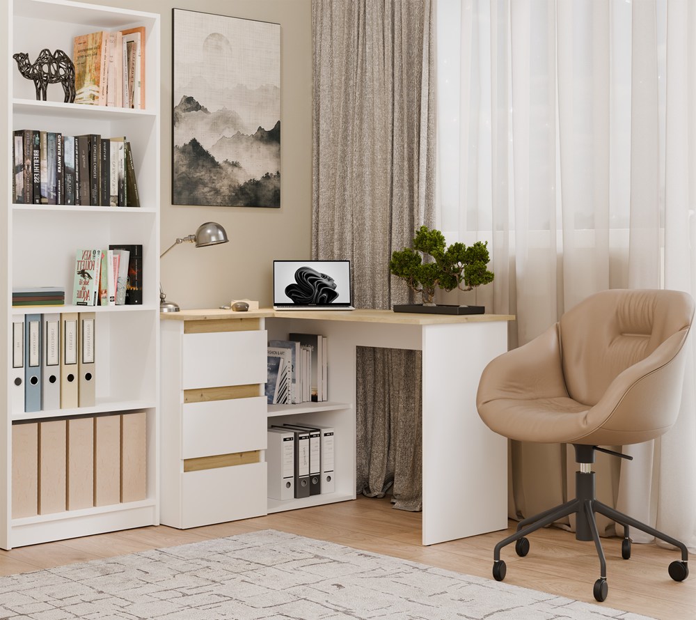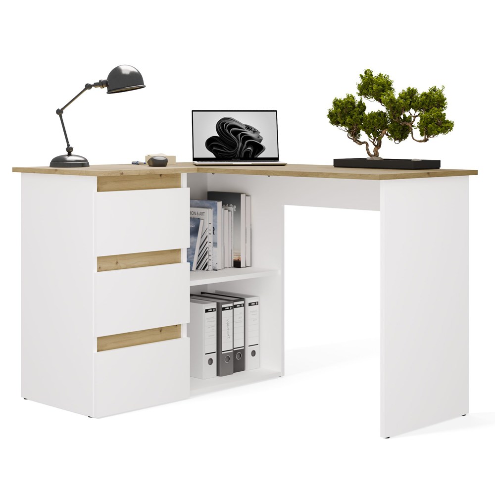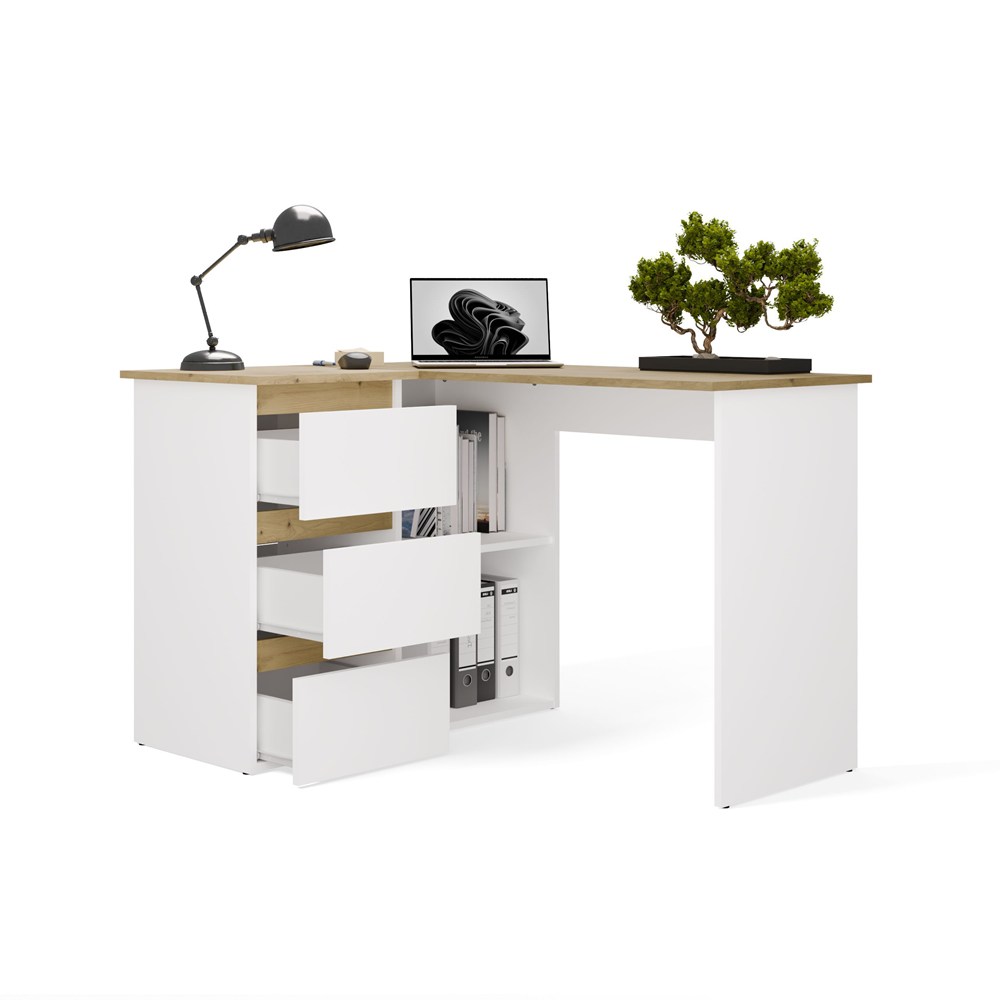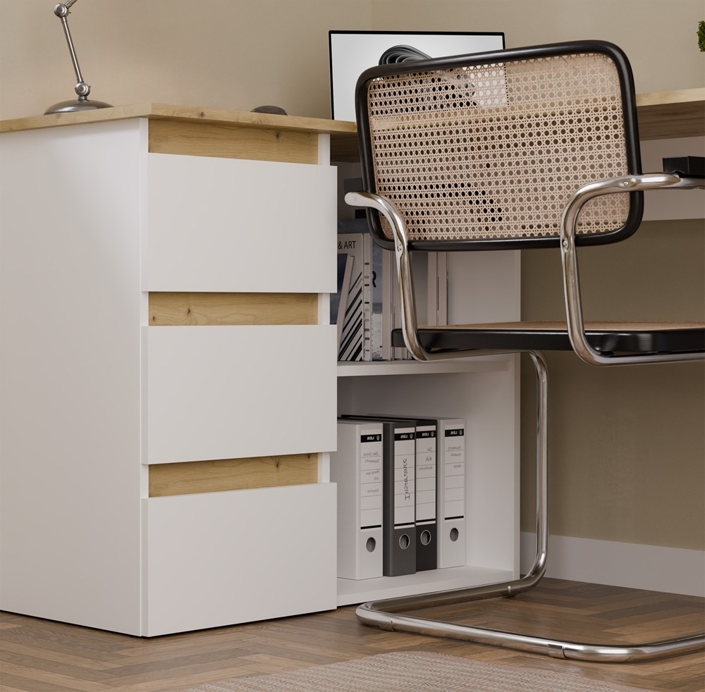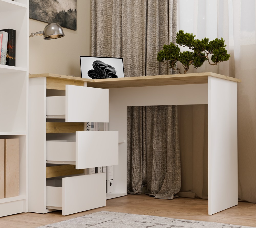 Biurko wyposażono w pojemne szuflady oraz otwarte półki, które ułatwiają organizację dokumentów i akcesoriów. Duży blat roboczy daje komfortową przestrzeń na komputer i codzienne zadania, a narożna konstrukcja pozwala maksymalnie wykorzystać dostępne miejsce.