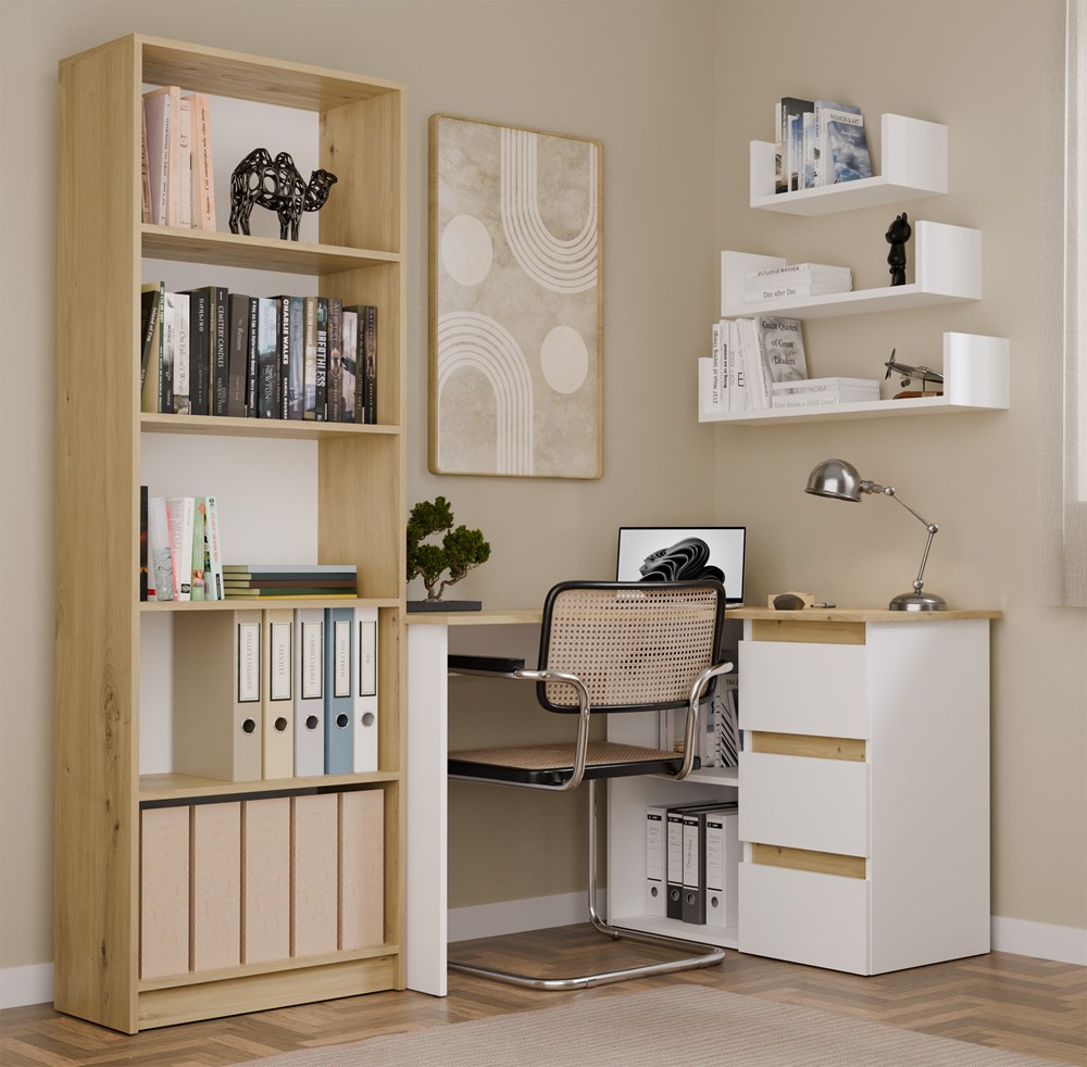 Biurko wyposażono w pojemne szuflady oraz otwarte półki, które ułatwiają organizację dokumentów i akcesoriów. Duży blat roboczy daje komfortową przestrzeń na komputer i codzienne zadania, a narożna konstrukcja pozwala maksymalnie wykorzystać dostępne miejsce.