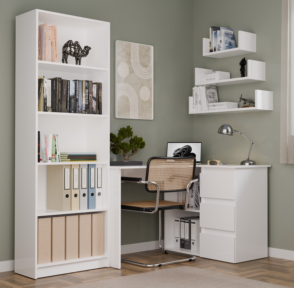 Nowoczesne biurko narożne w kolorze białym to idealne rozwiązanie do pracy i nauki w domowym biurze. Minimalistyczna forma świetnie wpisuje się w różne aranżacje, a przemyślany układ zapewnia wygodę użytkowania.