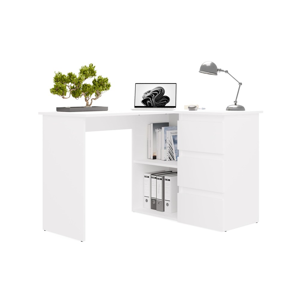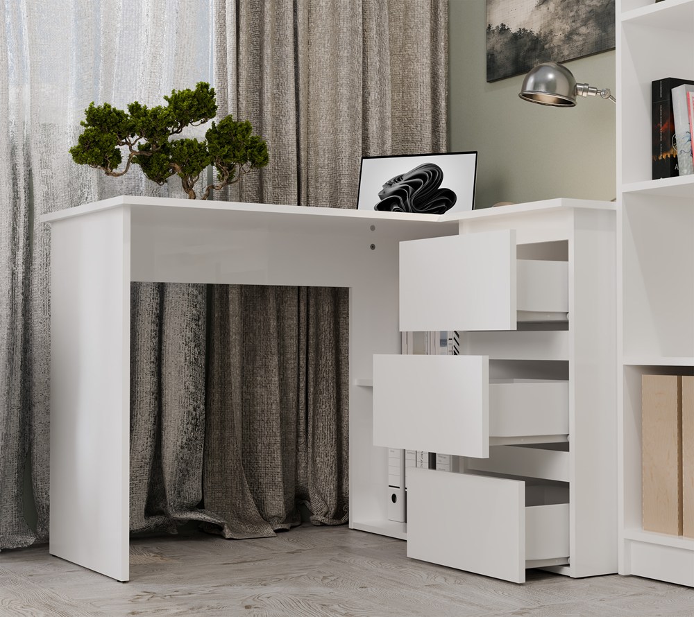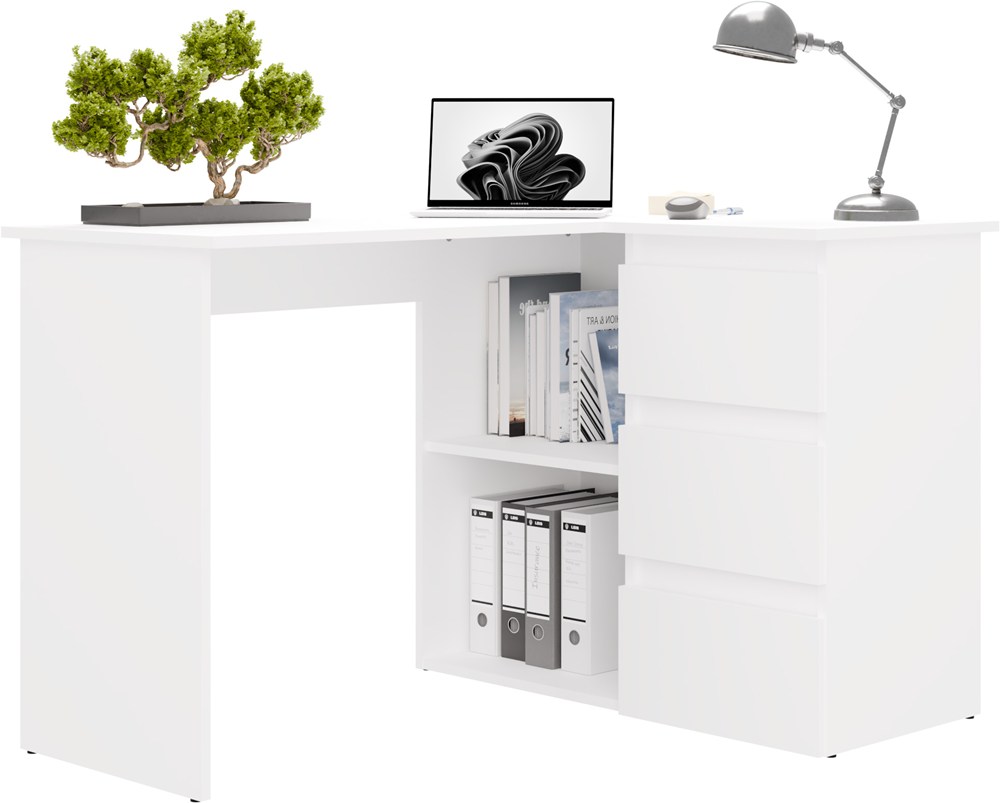 Biurko wyposażono w pojemne szuflady oraz otwarte półki, które ułatwiają organizację dokumentów i akcesoriów. Duży blat roboczy daje komfortową przestrzeń na komputer i codzienne zadania, a narożna konstrukcja pozwala maksymalnie wykorzystać dostępne miejsce.