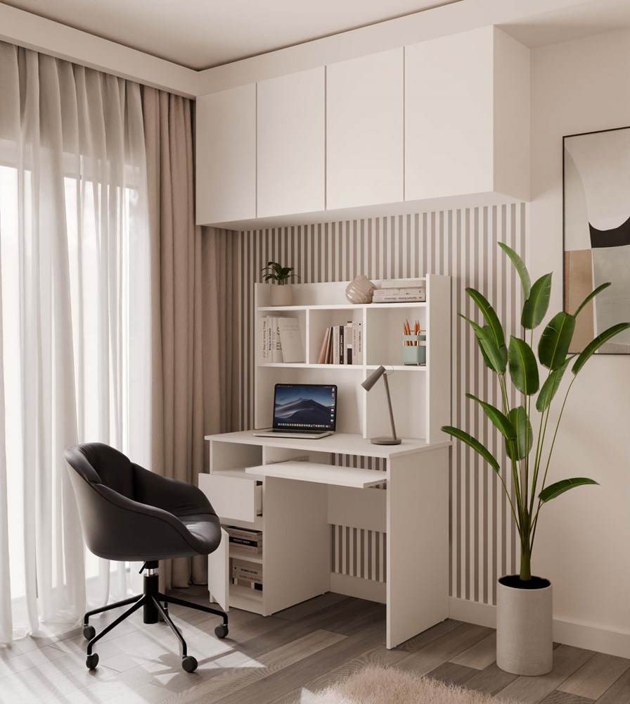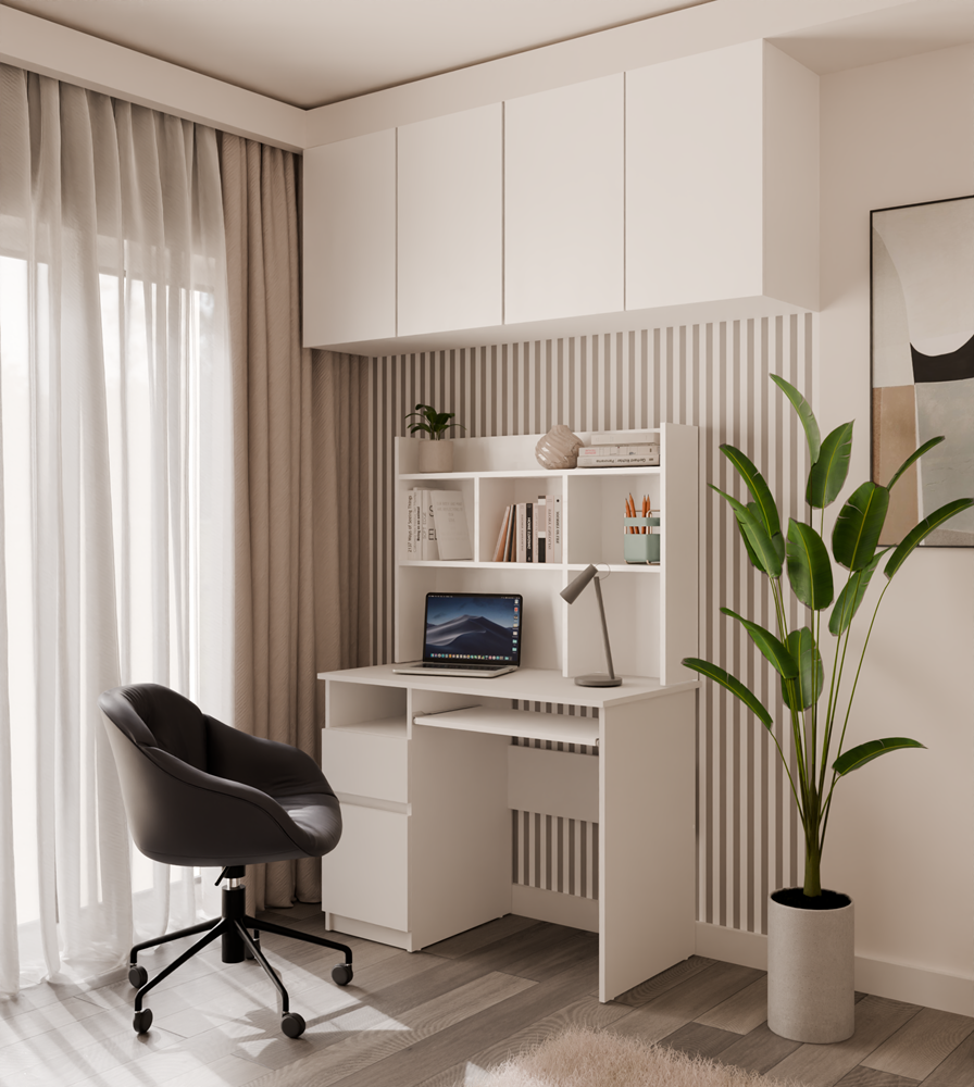 Nowoczesna forma, matowa biel oraz praktyczny układ przechowywania sprawiają, że mebel idealnie odnajdzie się zarówno w pokoju młodzieżowym, dziecięcym, jak i domowym biurze.