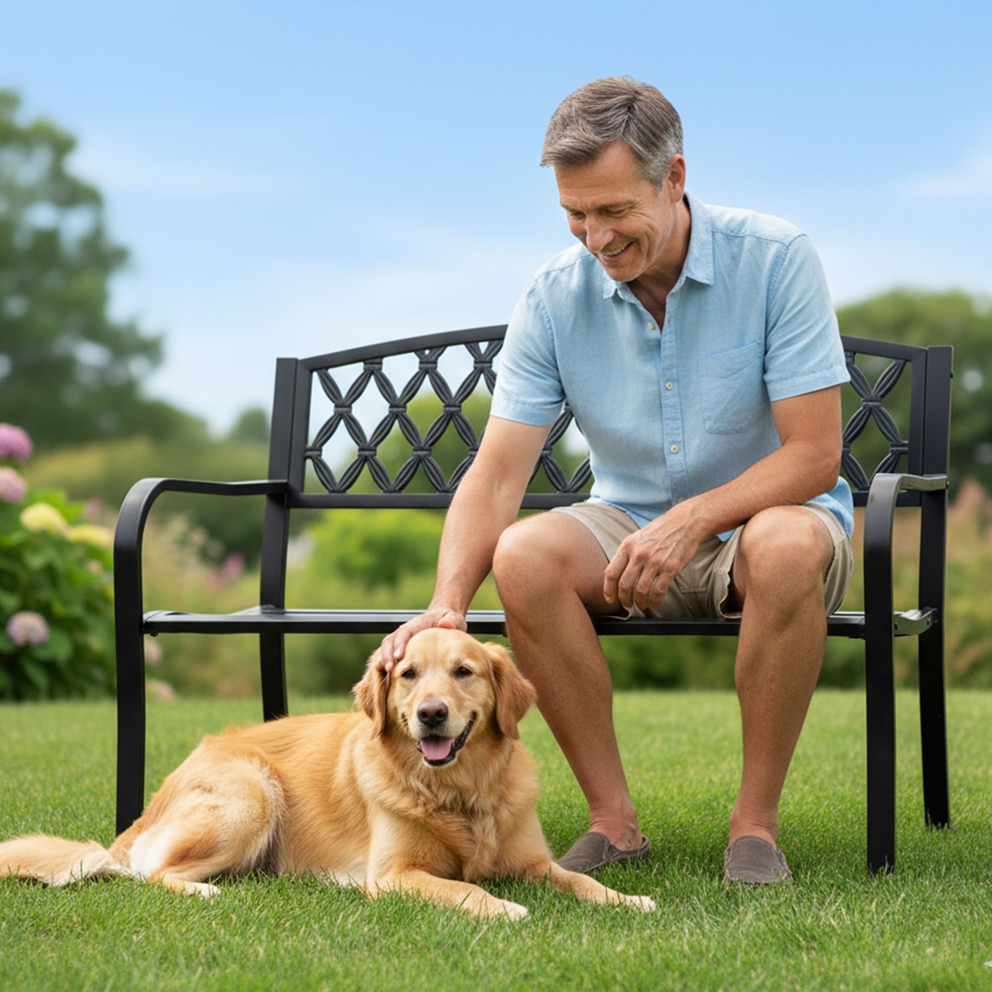 Czarna ławka ogrodowa CLASSICO ze stalowymi nogami i żeliwnym oparciem szerokość 127 cm