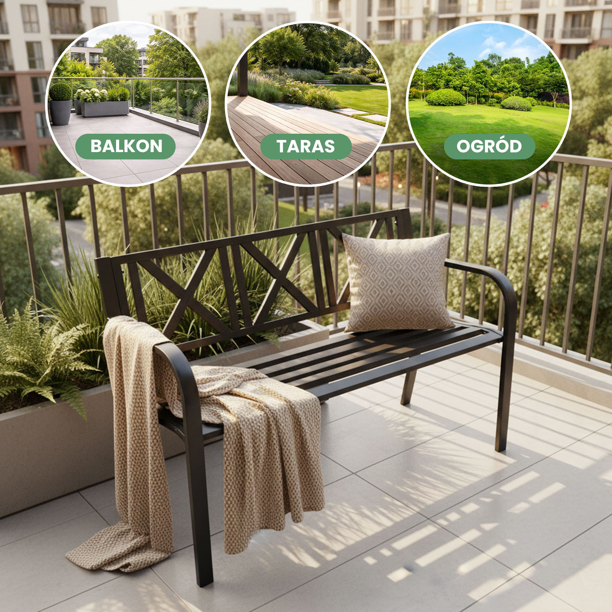Czarna ławka ogrodowa CROSS ze stalowymi nogami i oparciem szerokość 119 cm