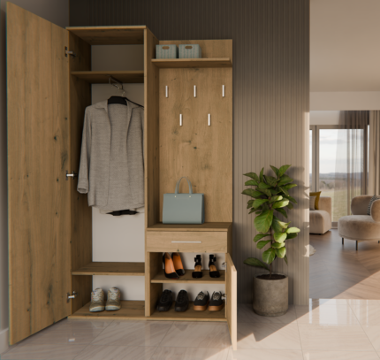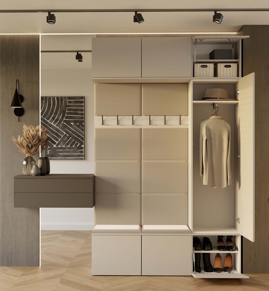Dzięki przemyślanej, modułowej konstrukcji, każdy z elementów można swobodnie zestawiać, a całość tworzy elegancką i praktyczną przestrzeń wejściową – idealną zarówno do mieszkań, jak i domów jednorodzinnych.