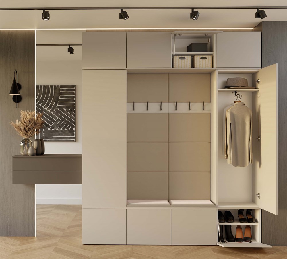 Dzięki przemyślanej, modułowej konstrukcji, każdy z elementów można swobodnie zestawiać, a całość tworzy elegancką i praktyczną przestrzeń wejściową – idealną zarówno do mieszkań, jak i domów jednorodzinnych.