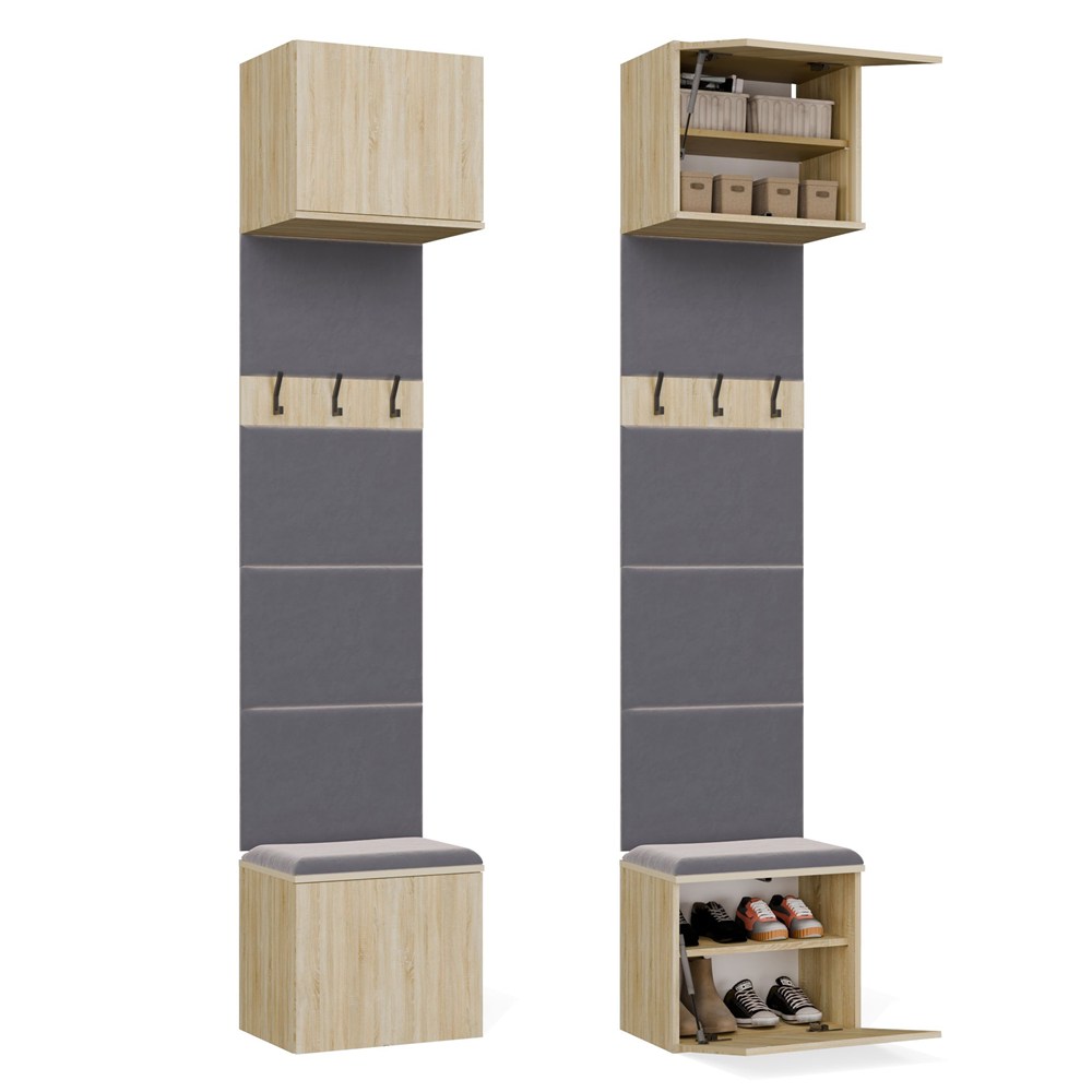 HAGA 1W to kompaktowy i funkcjonalny mebel do przedpokoju, który łączy wygodne siedzisko z miejscem do przechowywania, panel z wieszakami na odzież oraz praktyczną szafkę górną.