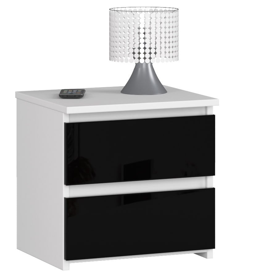 Szafka nocna z serii CL2 dostępna jest w wersji z frontami wykonanymi z czarnej płyty na wysoki połysk oraz konstrukcją wykonaną z płyty laminowanej MDF z powłoką akrylową. Szafka ma wymiary 40x40x35 cm i w standardowej wersji zawiera dwie funkcjonalne szuflady. Obrzeże szafki wykonane jest z okleiny ABS. Jest to mebel do samodzielnego montażu w warunkach domowych.