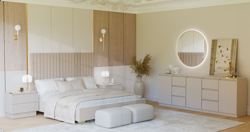 - Bezuchwytowe fronty szuflad oraz drzwi zapewniają wygodne użytkowanie i podkreślą modernistyczny charakter wnętrza.