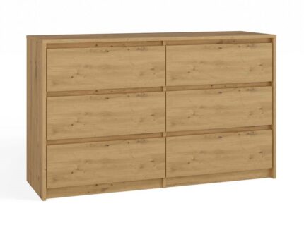 Komoda K 140 z 4 szufladami została wykonana z odpornej na ścieranie, laminowanej płyty meblowej Kronospan. Korpus K 140 ma biały kolor, natomiast fronty szafek i szuflad zostały utrzymane w barwie dębu sonoma. Centralną część komody stanowi rząd 4 szuflad usytuowanych jedna nad drugą, natomiast po obydwu bokach komody zaprojektowane zostały pojedyncze drzwiczki. Szuflady wysuwają się i wsuwają dzięki metalowym prowadnicom rolkowym, zapewniając dużą przestrzeń do przechowywania. Po otwarciu drzwiczek użytkownik może skorzystać z dwóch szafek wyposażonych w dwie półki każda.