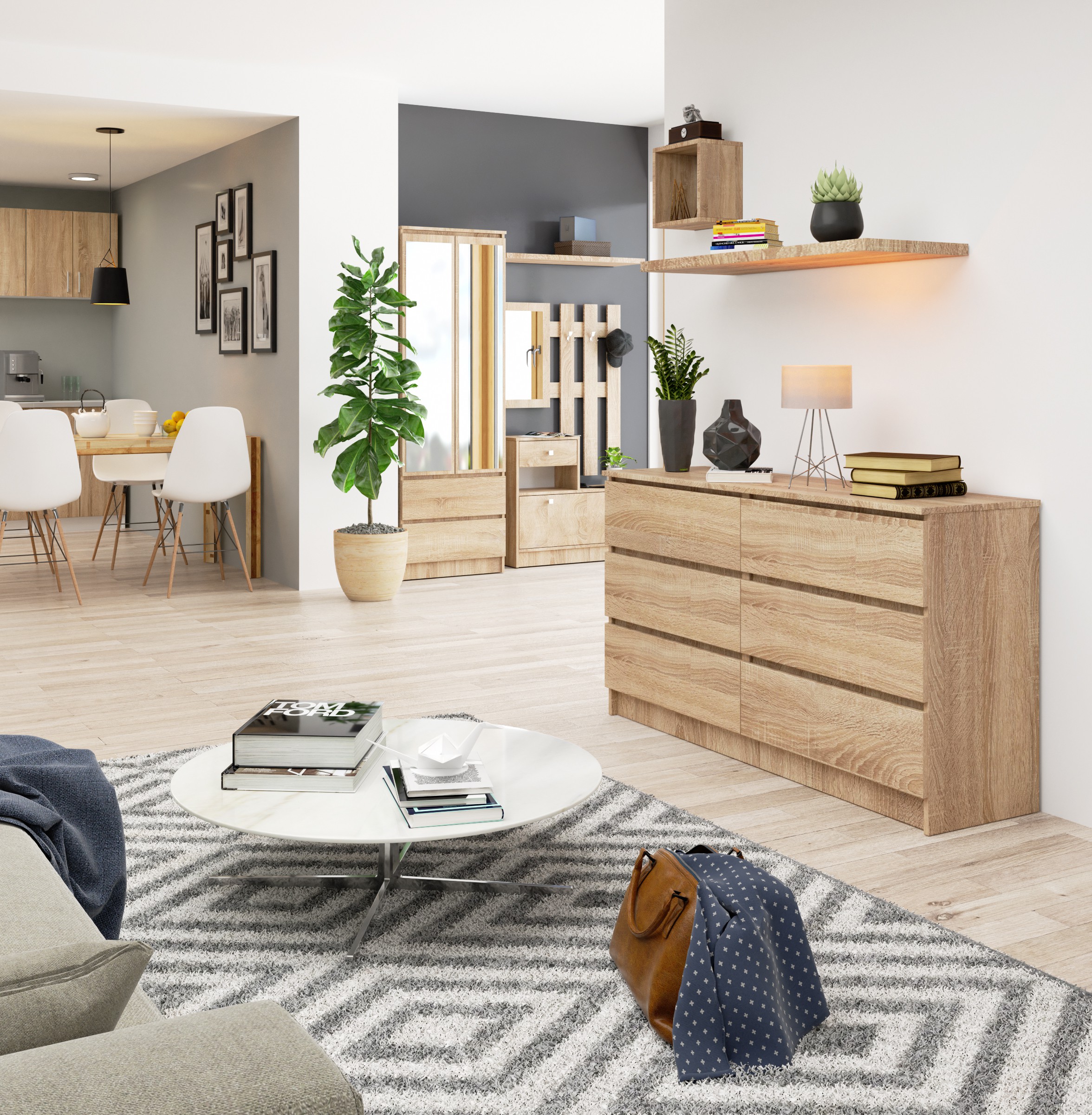 Sześć praktycznych szuflad, długi blat oraz kolor, który zdecydowanie cieszy się największym zainteresowaniem wśród osób preferujących łatwe w czyszczeniu, uniwersalne i ponadczasowe meble – to właśnie cechy, jakimi charakteryzuje się komoda K140 w kolorze dąb sonoma. Propozycja zasługuje na uwagę przede wszystkim ze względu na swój design oraz wyjątkową funkcjonalność, jednak warto zwrócić uwagę także na wysoką jakość oraz staranne wykonanie mebla, który z powodzeniem może zostać zastosowany zarówno w pomieszczeniu o charakterze biurowym, jak i pokoju dziennym, jadalni, sypialni czy wielu innych wnętrzach mieszkalnych. Solidne wykonanie z wytrzymałych materiałów z pewnością zostanie docenione przez najbardziej wymagających klientów, dla których atutem mebla będzie również jego korzystna cena.