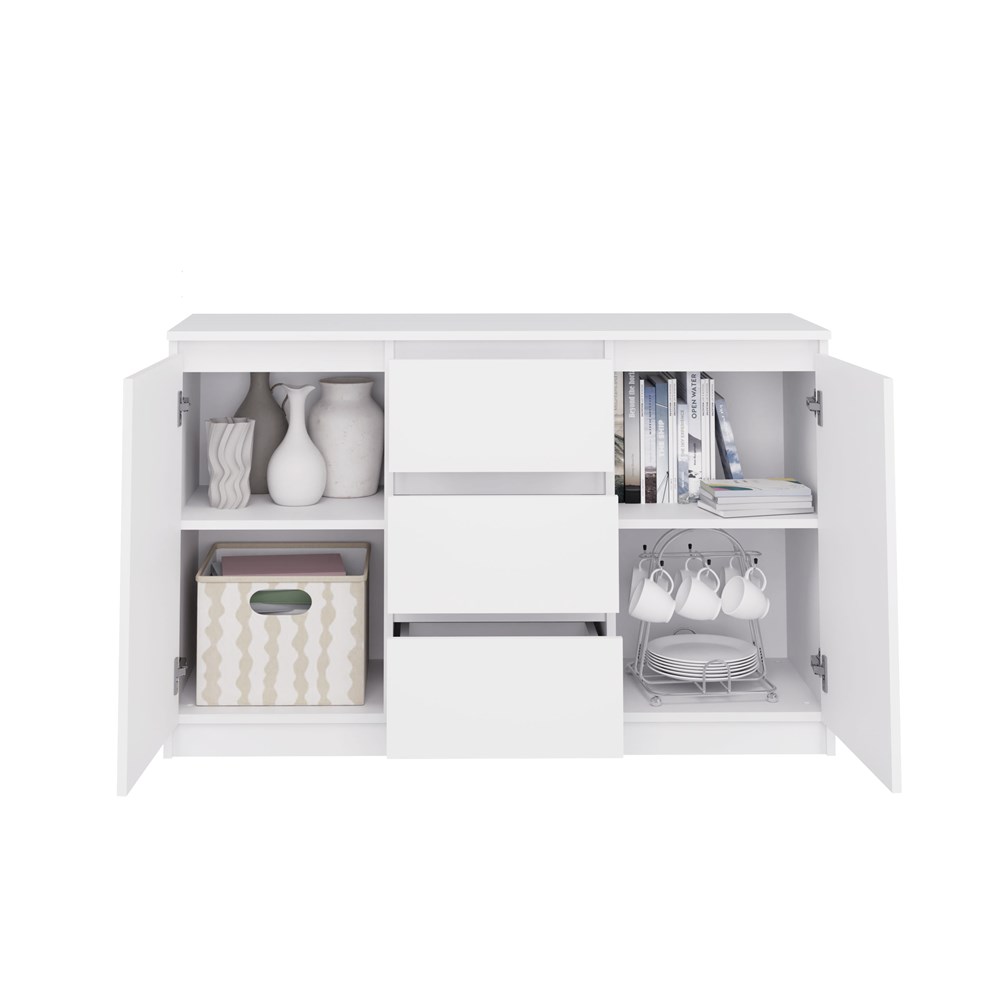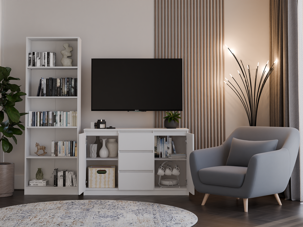 Wnętrze komody składa się z półek oraz trzech szuflad, które pomogą przy rozmieszczaniu rzeczy. Łatwiej będzie znaleźć to, czego się szuka.