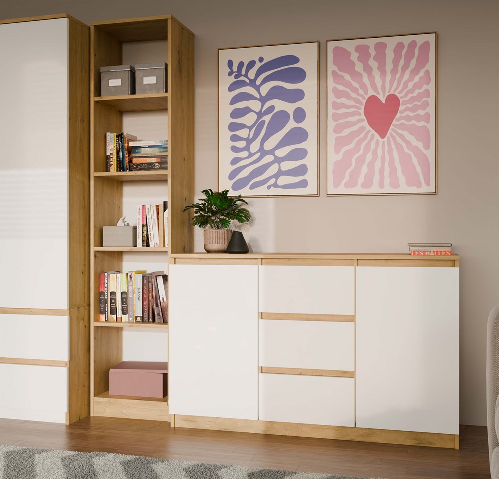 Komoda 2D3S to doskonałe połączenie nowoczesnego designu i funkcjonalności. Nowoczesny, elegancki design, który łączy ciepły odcień dębu Artisan z klasycznym białym frontem, nadaje wnętrzu wyjątkowego charakteru. Zestawienie tych dwóch kolorów sprawia, że komoda doskonale komponuje się zarówno w nowoczesnych, jak i bardziej tradycyjnych aranżacjach.