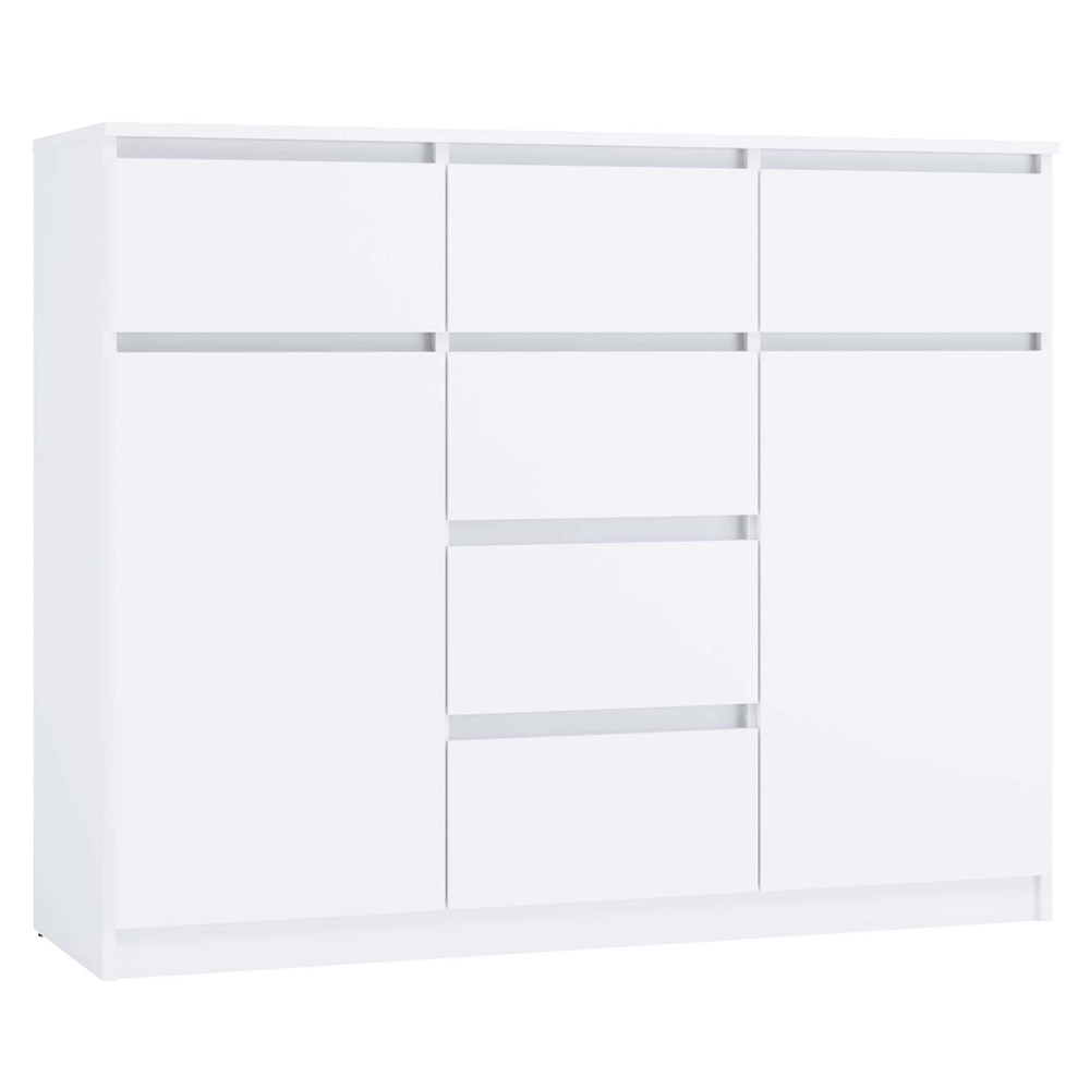 - Uniwersalny design: Prosta, elegancka forma komody w kolorze biel mat sprawia, że będzie pasować zarówno do nowoczesnych, jak i klasycznych aranżacji wnętrz. Bezuchwytowe fronty podkreślają minimalistyczny charakter, jednocześnie zapewniając wygodę użytkowania.