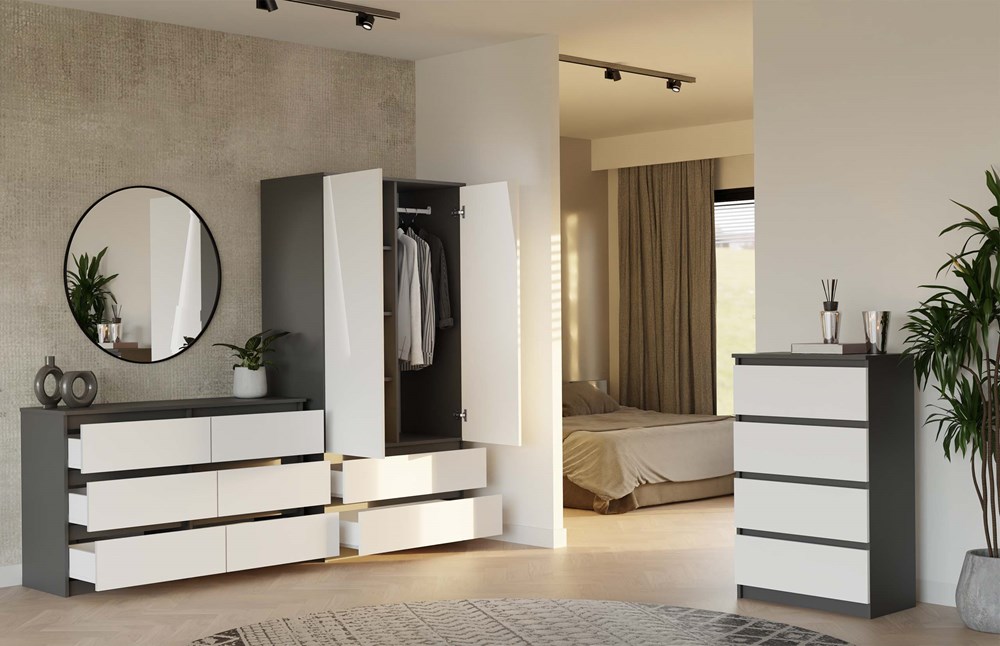 Połączenie korpusu w dekorze Antracyt z minimalistycznymi, białymi frontami nadaje komodzie świeży i elegancki wygląd. Taki design świetnie wpasuje się zarówno w jasne, skandynawskie wnętrza, jak i bardziej klasyczne czy nowoczesne aranżacje.