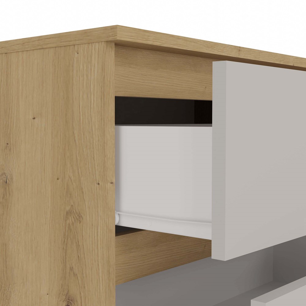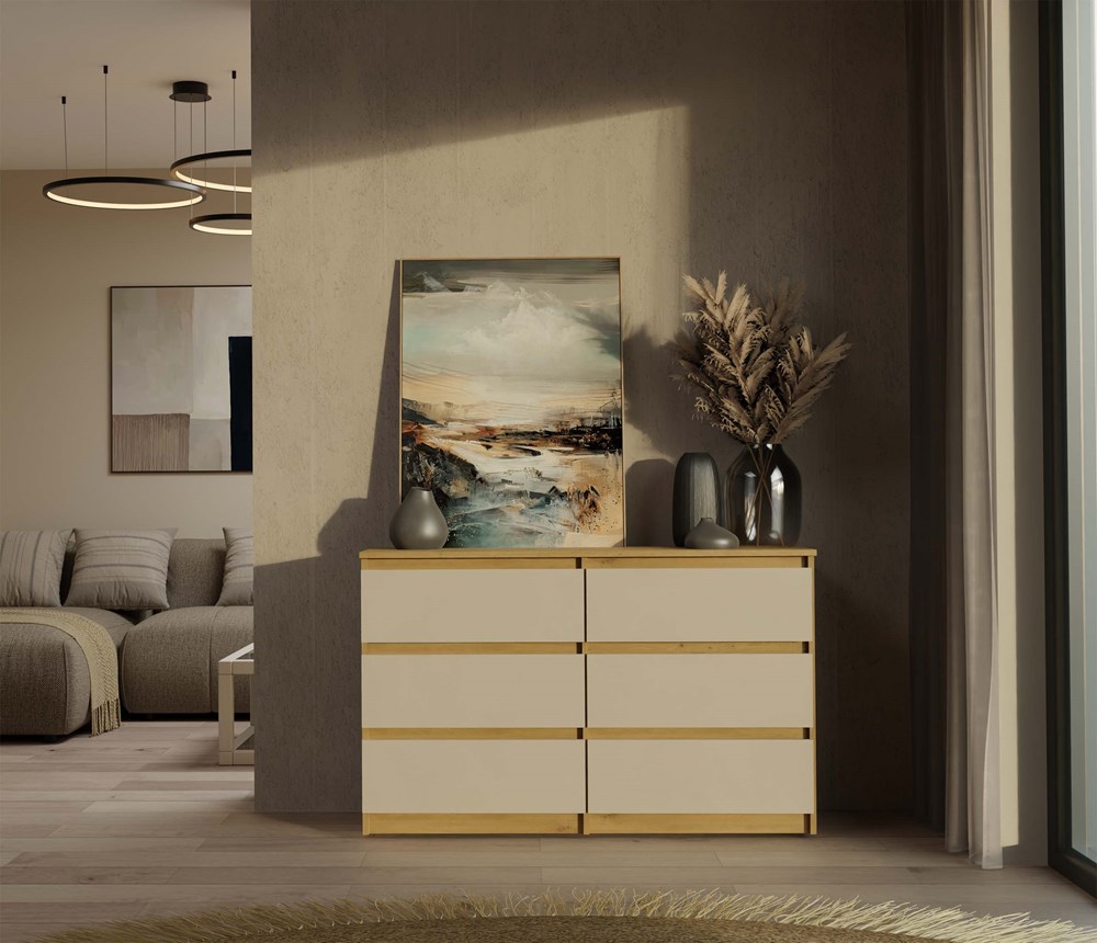 Połączenie korpusu w dekorze Dąb Artisan z minimalistycznymi, Kaszmirowymi frontami nadaje komodzie świeży i elegancki wygląd. Taki design świetnie wpasuje się zarówno w jasne, skandynawskie wnętrza, jak i bardziej klasyczne czy nowoczesne aranżacje.