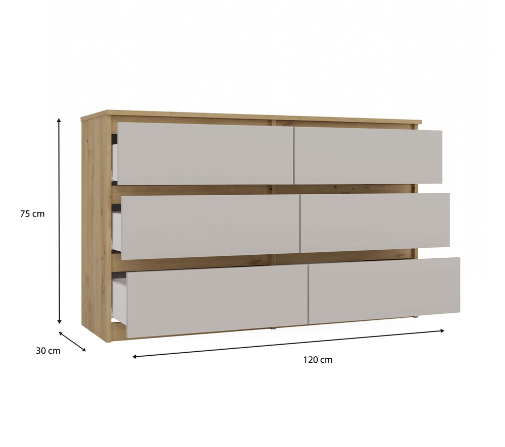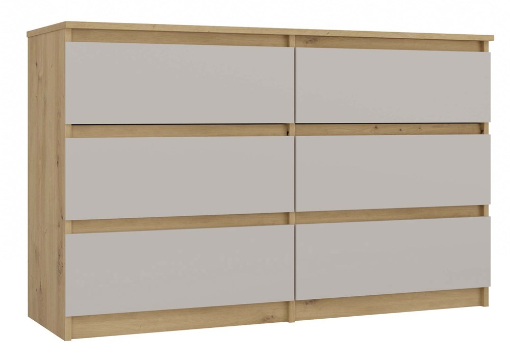 Komoda MALWA M6 to przestronny i stylowy mebel, który doskonale sprawdzi się w sypialni, salonie, pokoju dziecka czy gabinecie. Dzięki 6 pojemnym szufladom zapewnia dużą przestrzeń do przechowywania, ułatwiając organizację ubrań, dokumentów i innych akcesoriów.