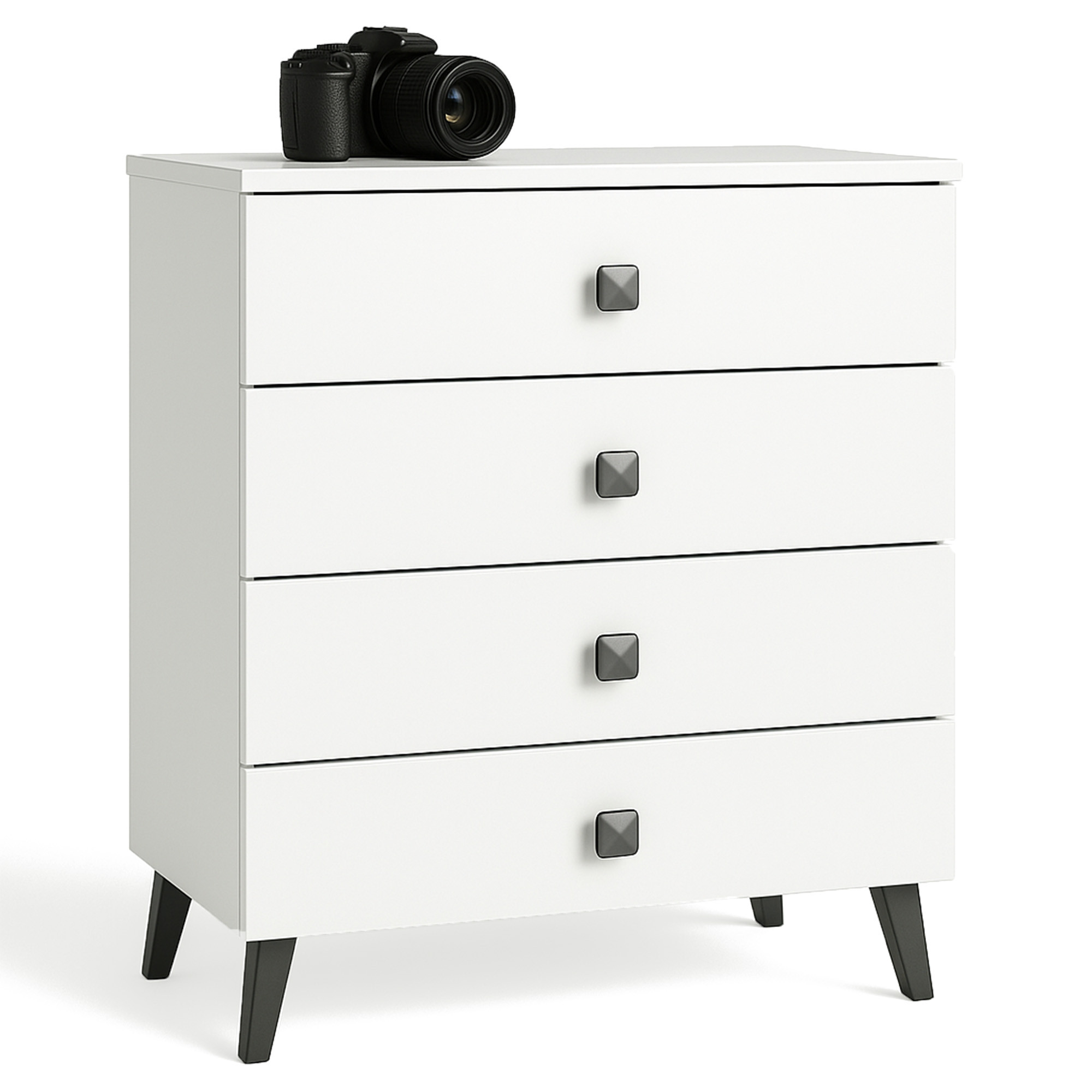 Niewielka komoda to element wyposażenia, który znajdzie zastosowanie w każdym pomieszczeniu. Nowoczesne barwy, solidna konstrukcja i staranne wykonanie zaowocowało powstaniem szafki, która sprawdzi się na przykład w przedpokoju, pokoju dziennym czy młodzieżowym, a także w sypialni. Może być wykorzystana również w pomieszczeniu biurowym, gdzie umożliwi przechowywanie licznych dokumentów oraz innych artykułów o charakterze biurowym. Komoda składa się z 4 szuflad. Mebel łączy w sobie kolorystykę białą i czarną.