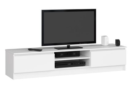 Dodatkowym elementem dekoracyjnym, a przy tym świetną podstawką pod telewizor może okazać się prezentowana tutaj szafka. Świetnie dobrana stylistyka, a także stonowane barwy szafki z pewnością pozwolą na odpowiednie dopasowanie produktu do pozostałych mebli w mieszkaniu. Mebel jest zarówno funkcjonalny jak i praktyczny. Szafka została przygotowana pod duże telewizory o średnicy rzędu 50-60 cali. Konstrukcja produktu ułatwia ustawienie oraz utrzymanie ciężaru telewizora ii wszystkich dodatkowych akcesoriów. Szafka posiada również wygodne półki z zamykanymi odpowiednio dopasowanymi drzwiczkami.