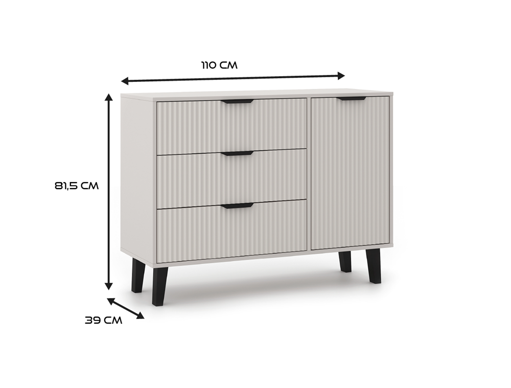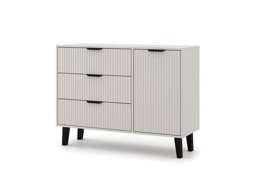 Fronty drzwi i szuflad ozdobione zostały eleganckim ryflowaniem, które nadaje meblowi charakterystyczny wygląd inspirowany lamelami. Całość dopełniają czarne uchwyty i wysokie, czarne nóżki nadające meblowi lekkości i wyjątkowego stylu.