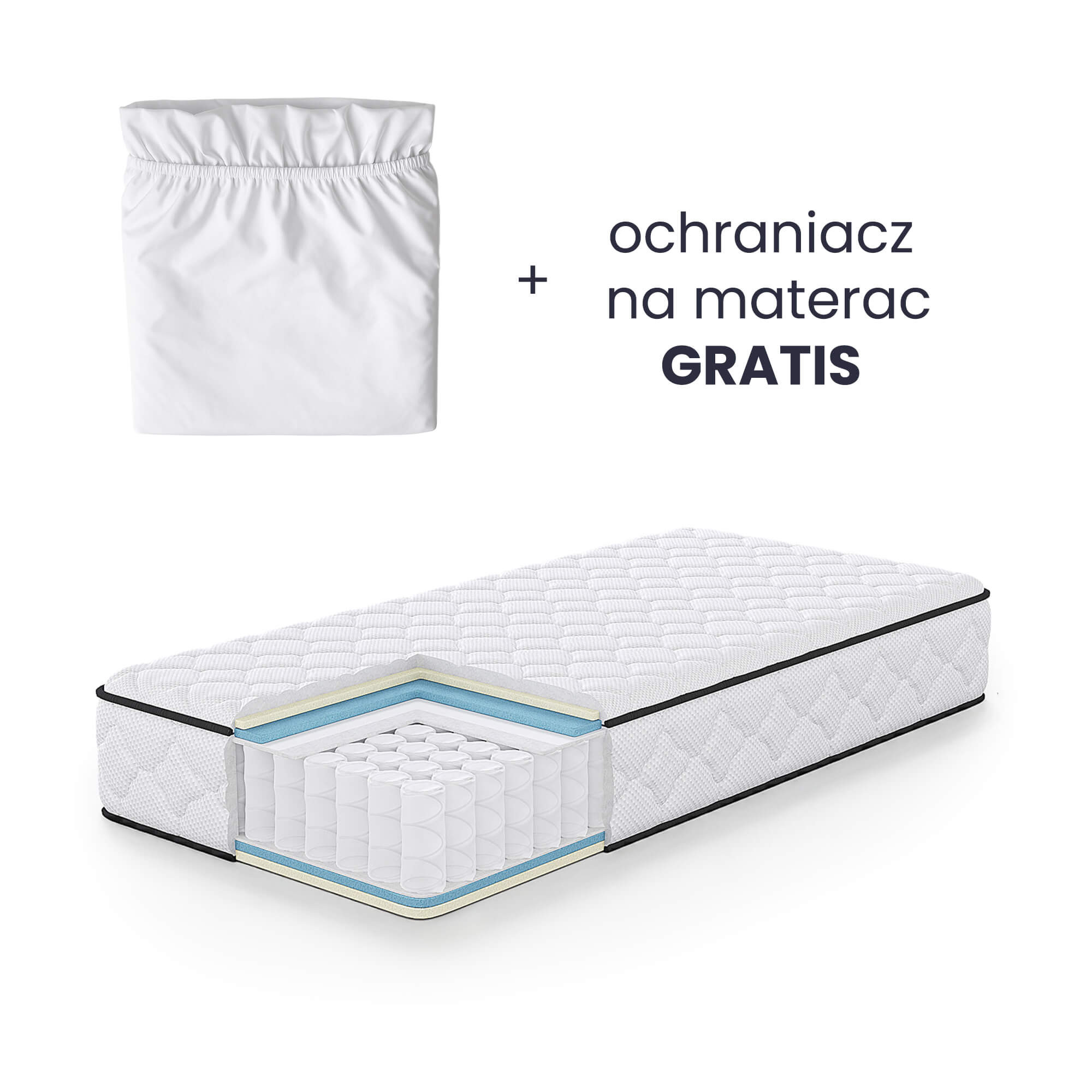 Materac sprężynowy o średniej twardości – H3 – dopasowuje się do kształtu pleców, zapewniając użytkownikom wysoki poziom komfortu podczas snu. Materac jest sprężysty, dobrze izoluje od podłoża i zapewnia odpowiednią cyrkulację powietrza. Optymalne maksymalne obciążenie na osobę to 100 kg.