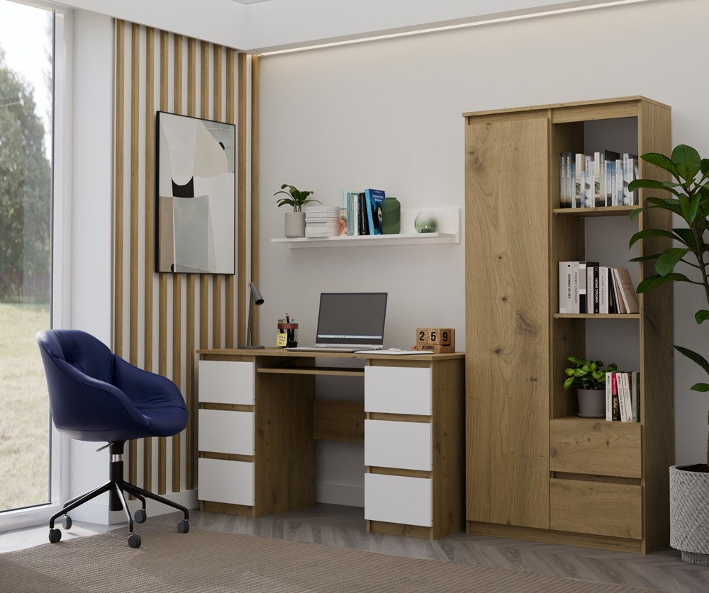 Doskonały w połączeniu z komodami, biurkami i szafkami RTV, tworząc harmonijną całość.