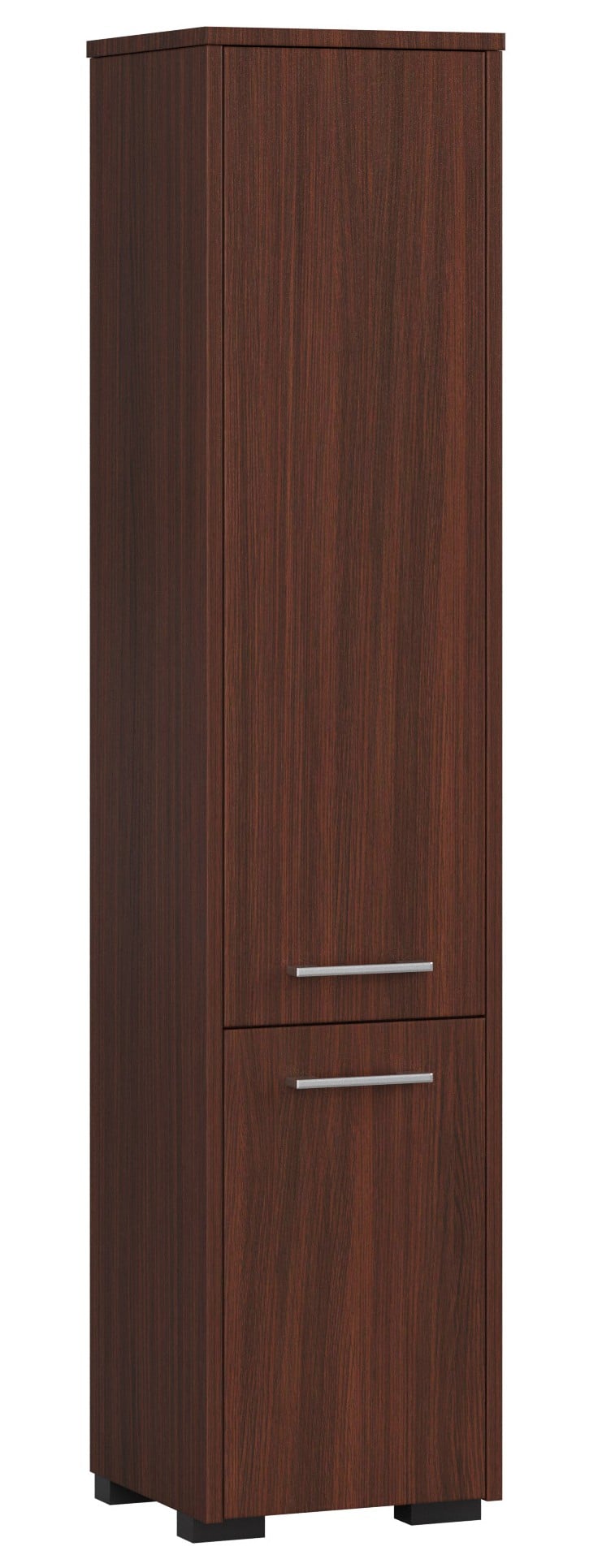 Słupek łazienkowy dwudrzwiowy oferowany przez nasz sklep to produkt, który pozwoli właściwie wykorzystać dostępną przestrzeń, a także podnieść jej walory estetyczne. Dzieje się tak, gdyż jest on optymalnie funkcjonalny oraz stylowy. Mebel ten składa się z dwóch drzwi – większych na górze oraz mniejszych na dole. Za nimi znajduje się praktyczny regał. Półki umożliwiają przechowywanie najrozmaitszych rzeczy, które są niezbędne w łazience, takich jak ręczniki, detergenty, środki higieniczne i proszki do prania. Ten niezwykle pojemny słupek na pewno zmieści akcesoria całej rodziny. Na uwagę zasługuje jego piękny odcień wenge. Jest to klasyczny kolor, który nada pomieszczeniu odpowiedniego szyku. Na drzwiach zamontowano bardzo stylowe uchwyty do otwierania. Jego wymiary pozawalają na umieszczenie go w łazience, gdzie do dyspozycji mamy niewiele miejsca. Dzięki ergonomicznemu kształtowi dopasuje się do każdego pomieszczenia. Obrzeża słupka zostały oklejone materiałem ABS, co gwarantuje, że nie zniszczy ich nawet długa eksploatacja mebla. Ponadto płyta laminowana wpływa na nieprzeciętną trwałość słupka.