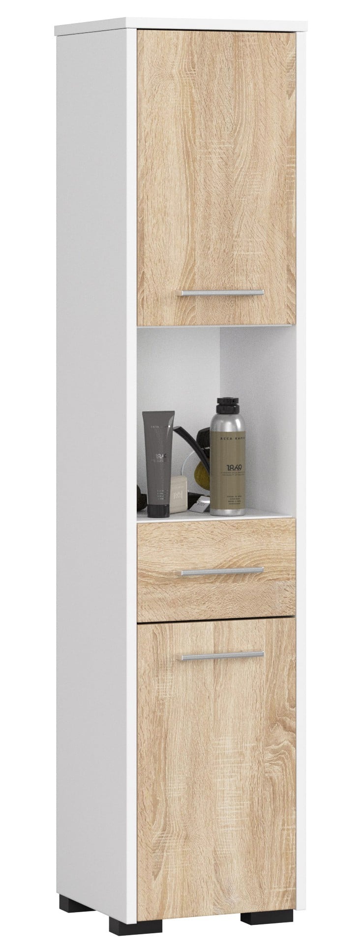 Słupek regał łazienkowy FIN 2D 1SZ 1W to elegancki i funkcjonalny mebel, w którym przechowywać można ręczniki, kosmetyki oraz inne akcesoria łazienkowe. Składa się z półki, szuflady i dwóch szafek, dając tym samym wiele wolnych przestrzeni do zagospodarowania. Mebel ma kolor biały, ale fronty szafek są w kolorze sonoma, co daje ciekawy efekt wizualny. Uchwyty drzwiczek są koloru srebrnego. Słupek to mebel nowoczesny i stylowy, który ułatwi utrzymanie porządku w łazience. Został wykonany z wysokogatunkowej płyty laminowanej (16 mm) firmy Krospan, a jego krawędzie są oklejone obrzeżem ABS.
