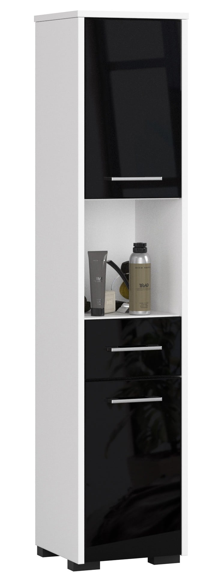 Regały łazienkowe to funkcjonalne meble, które pozwalają na utrzymanie porządku w łazience. W ich wnętrzu umieścić można ręczniki, kosmetyki i inne akcesoria związane z utrzymaniem higieny osobistej. Regały mogą przy okazji modnie się prezentować. Przykładem na to jest słupek regał łazienkowy FIN 2D 1SZ 1W, który przykuwa wzrok swoją kolorystyką – połączniem bieli z czernią z połyskiem. Całości dopełniają uchwyty do drzwiczek srebrnego koloru. Mebel składa się z półki, szuflady i dwóch szaf, dając wiele wolnych przestrzeni do zagospodarowania. Przy okazji cechuje się trwałością i solidnością wykonania.