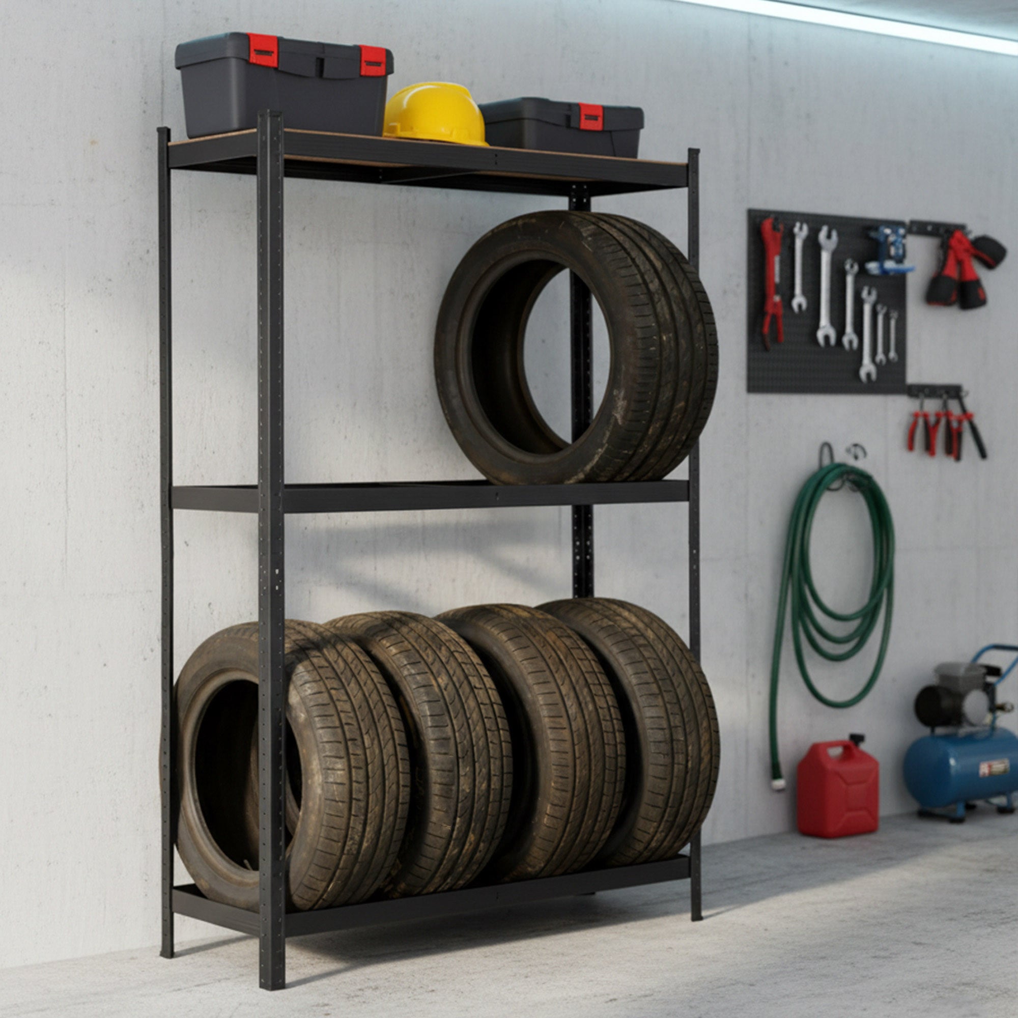Metalowy regał garażowy na opony to solidna konstrukcja wykonana z wytrzymałej stali, zapewniająca stabilne i bezpieczne przechowywanie opon sezonowych. Pomaga utrzymać porządek w garażu oraz efektywnie wykorzystać dostępną przestrzeń. Model dostępny jest w kolorze czarnym oraz srebrnym, dzięki czemu łatwo dopasować go do każdego wnętrza.