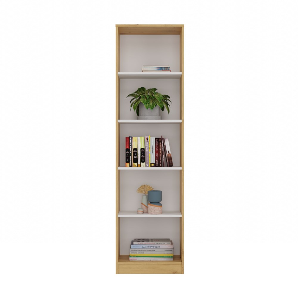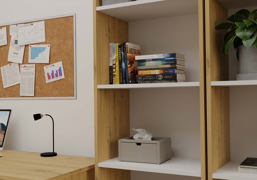 Regał R50 to stylowe i praktyczne rozwiązanie do przechowywania książek, segregatorów, dekoracji oraz materiałów biurowych. Połączenie ciepłego odcienia dębu artisan z kontrastującymi białymi półkami nadaje meblowi nowoczesny i elegancki charakter. Doskonale sprawdzi się zarówno w biurze, salonie, pokoju dziecka, jak i w domowej biblioteczce.