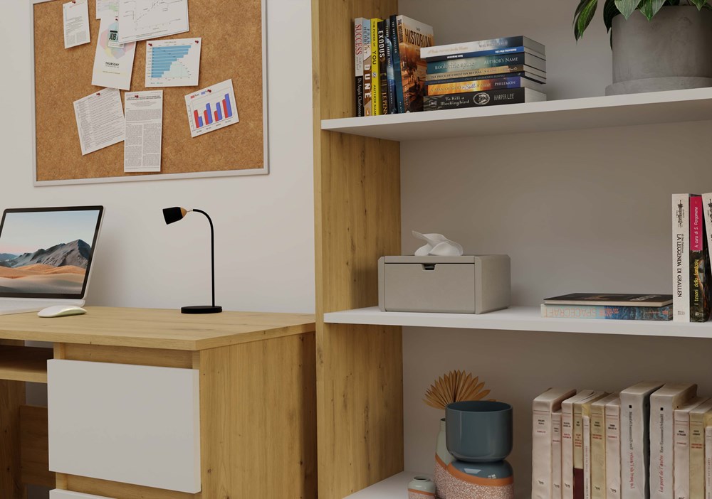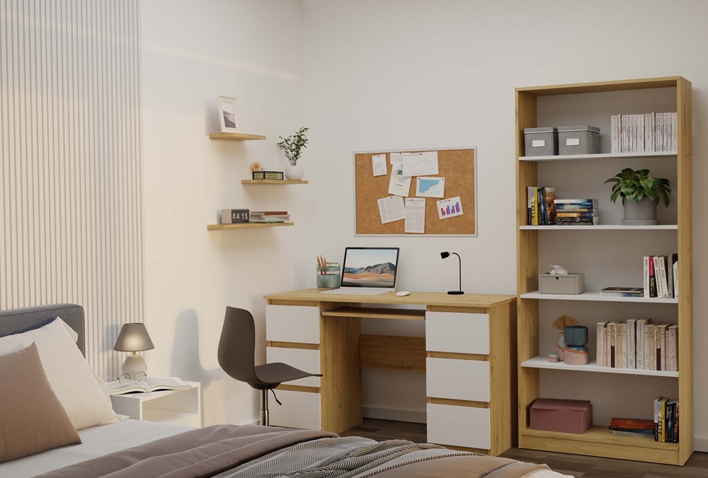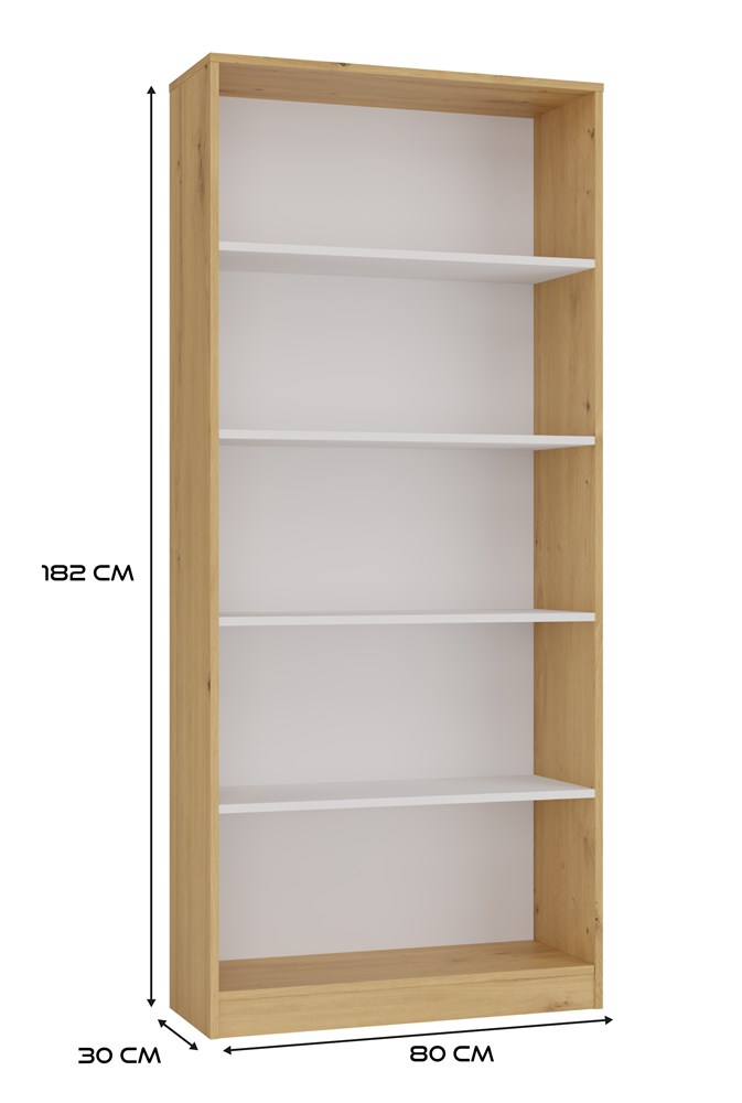 Regał R80 to stylowe i praktyczne rozwiązanie do przechowywania książek, segregatorów, dekoracji oraz materiałów biurowych. Połączenie ciepłego odcienia dębu artisan z kontrastującymi białymi półkami nadaje meblowi nowoczesny i elegancki charakter. Doskonale sprawdzi się zarówno w biurze, salonie, pokoju dziecka, jak i w domowej biblioteczce.