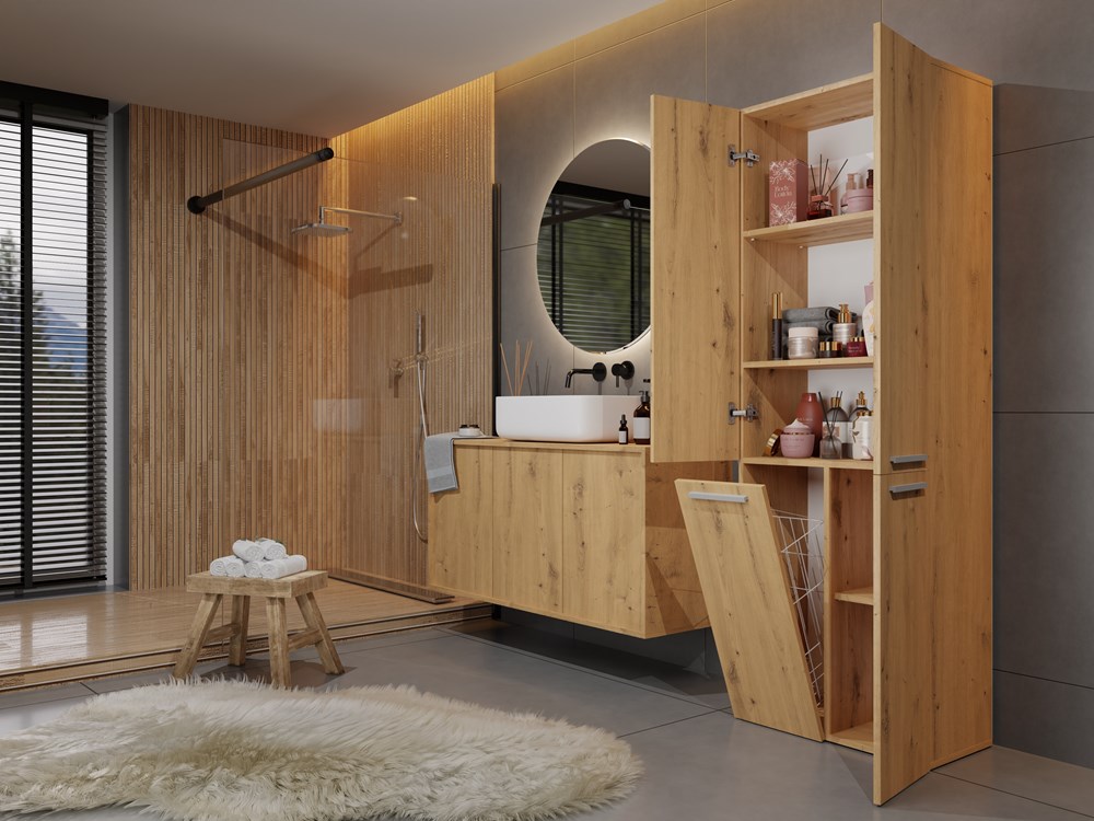 - W ofercie również szafki z otwartymi półkami oraz dwoma koszami