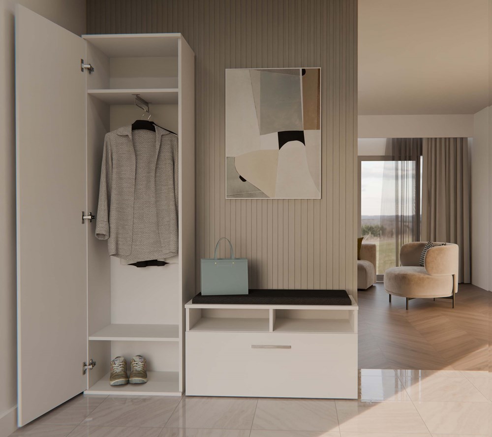 - Istnieje opcja zakupu pełnej garderoby DUO, obejmującej szafę DUO oraz dodatkową dostawkę z szafką i wieszakami.