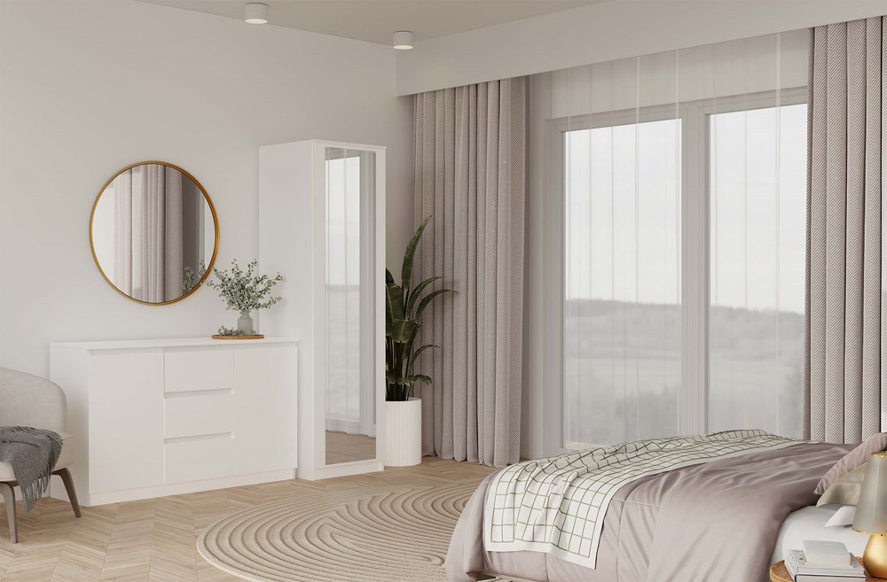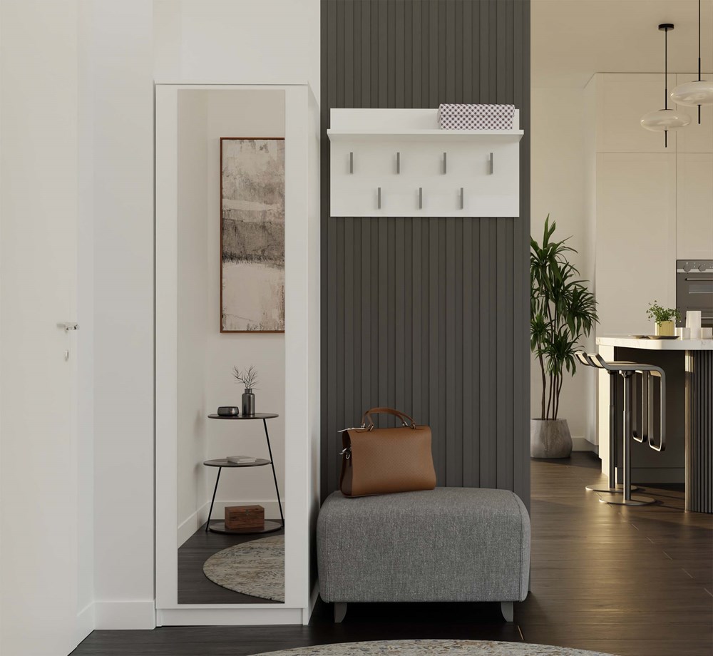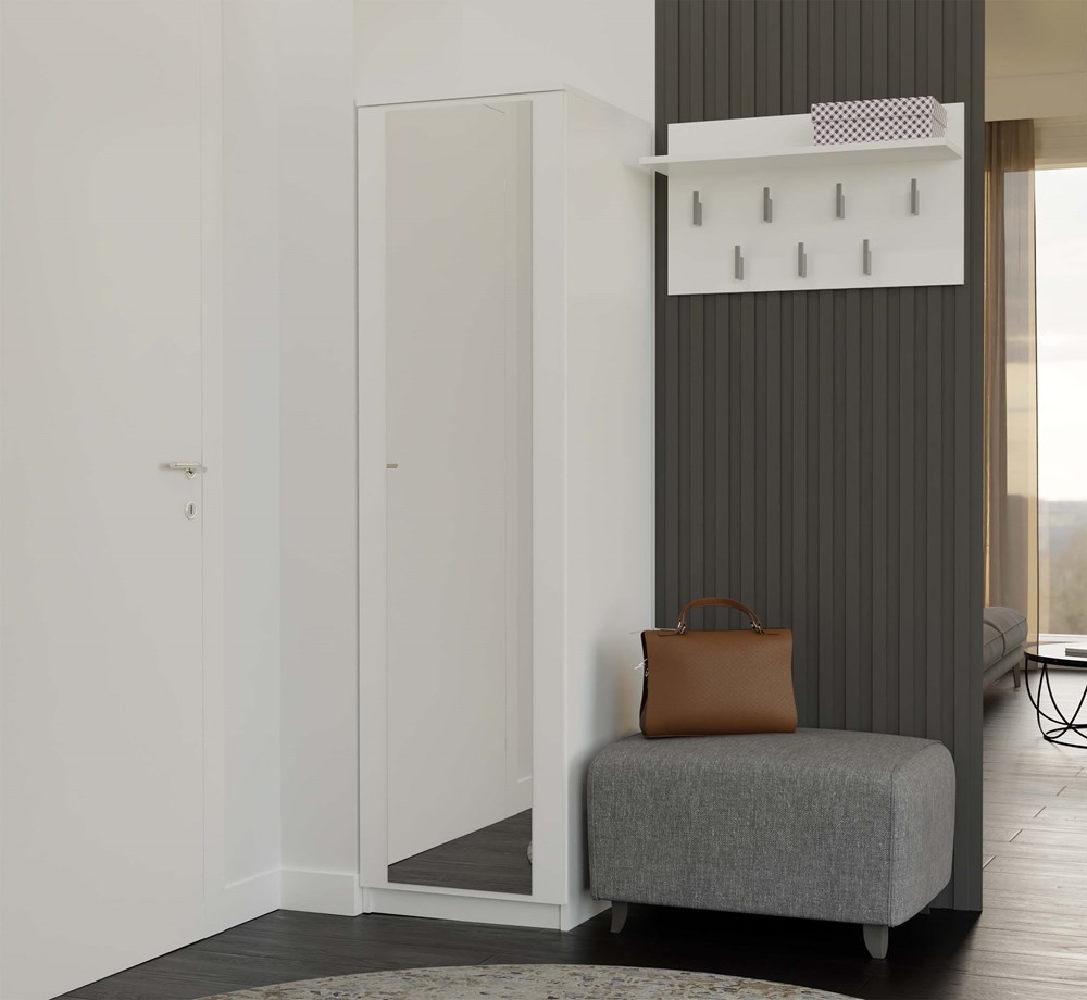 - Lustro na froncie – wąska szafa z pełnowymiarowym lustrem to doskonałe rozwiązanie do małych pomieszczeń