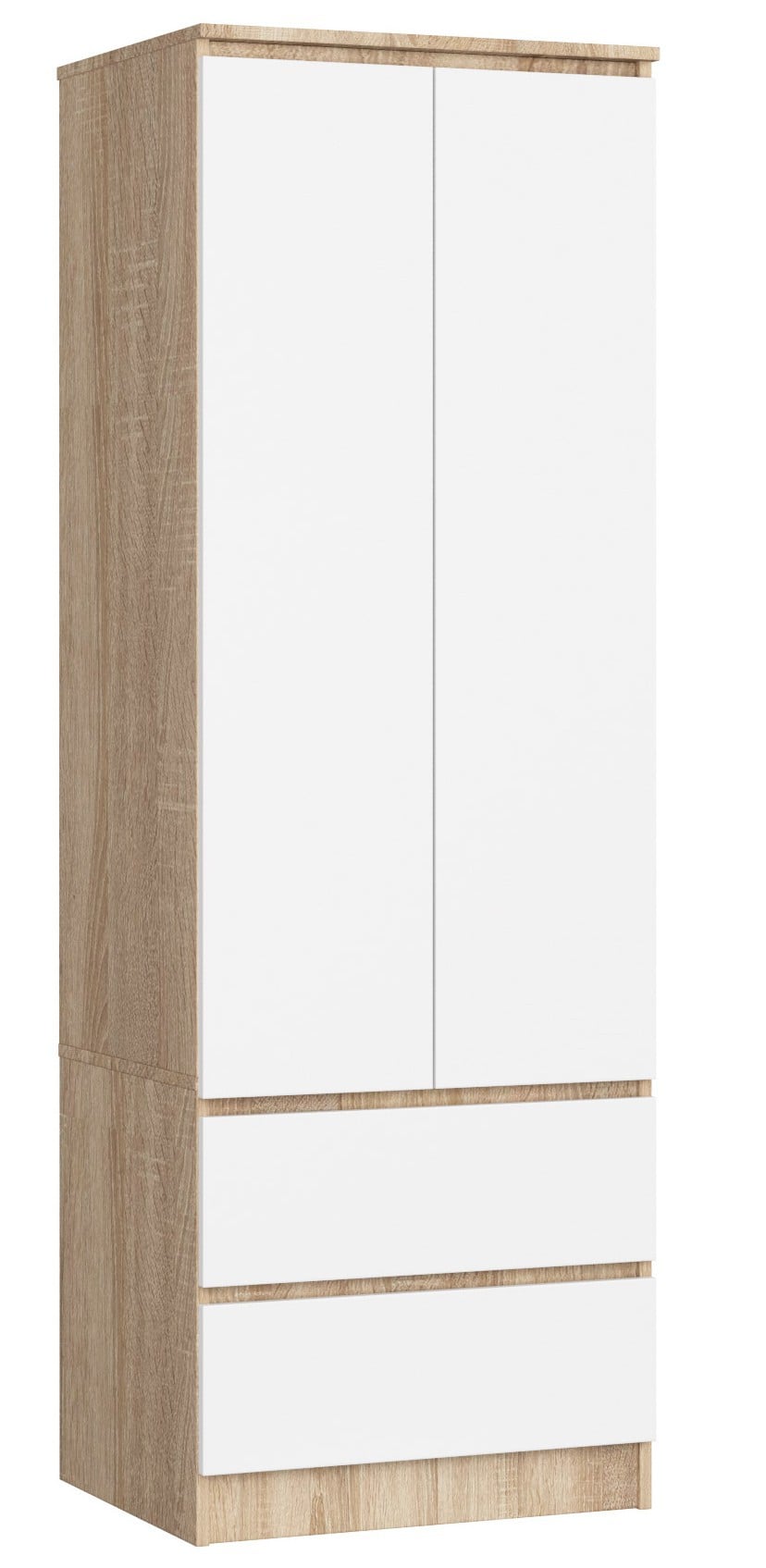 Szafa dąb sonoma z białym frontem znakomicie uzupełni umeblowanie salonu, dużego korytarza wejściowego albo ekskluzywnej sypialni. Doskonale dobrana kolorystyka mebla sprawia, że szafa będzie elegancko prezentować się w pomieszczeniach nowoczesnych i o wystroju tradycyjnym. Stojąca szafa 60cm ma dwie głębokie szuflady. Zastosowane wysokiej jakości nowoczesne metalowe prowadnice gwarantują ciche i bardzo łatwe ich wysuwanie i wsuwanie. Jako część umeblowania sypialni szafa przyda się na sukienki, piżamy, koszule, spodnie, skarpetki, jak również na koce, zapasowe poszwy do pościeli i kołdry czy prześcieradła. Jako element wyposażenia korytarza mebel sprawdzi się do przechowywania ubrań wierzchnich, nakryć głowy czy szalików. Część szafy nad szufladami zamykana jest na dwuskrzydłowe drzwiczki i wyposażona w wytrzymały drążek na wieszaki na ubrania, nad którym znajduje się pojemna półka. Mebel został wykonany z wysokiej jakości płyty laminowanej, która jest odporna na ścieranie, a jego krawędzie wykończone trwałym obrzeżem ABS.