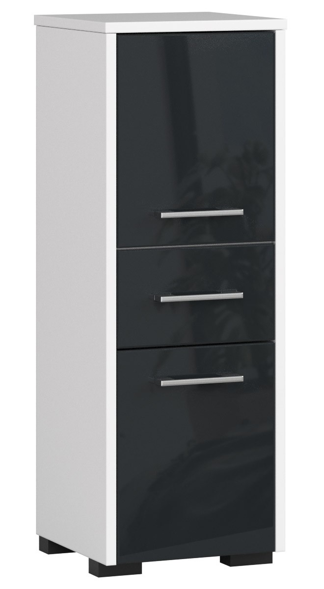 Kremy, balsamy, żele – miejsce tych i innych kosmetyków, z których korzystamy codziennie, jest w łazience. Do ich pomieszczenia warto zainwestować w szafkę słupek! Regał łazienkowy FIN ma 85 cm wysokości, 30 cm głębokości i 30 cm szerokości. Dzięki dwóch szafkom oraz jednej szufladzie doskonale pomieści nie tylko kosmetyki, ale także sprzęty takie jak suszarka, czy golarka. Minimalistyczny styl regału łączący biel oraz grafit jest doskonałym uzupełnieniem klasycznej bądź prostej łazienki. Srebrne uchwyty do drzwiczek wyjątkowo komponują się z łazienkową armaturą w tym samym kolorze.