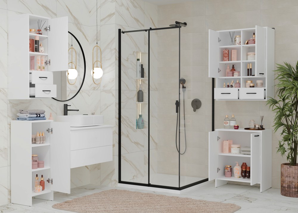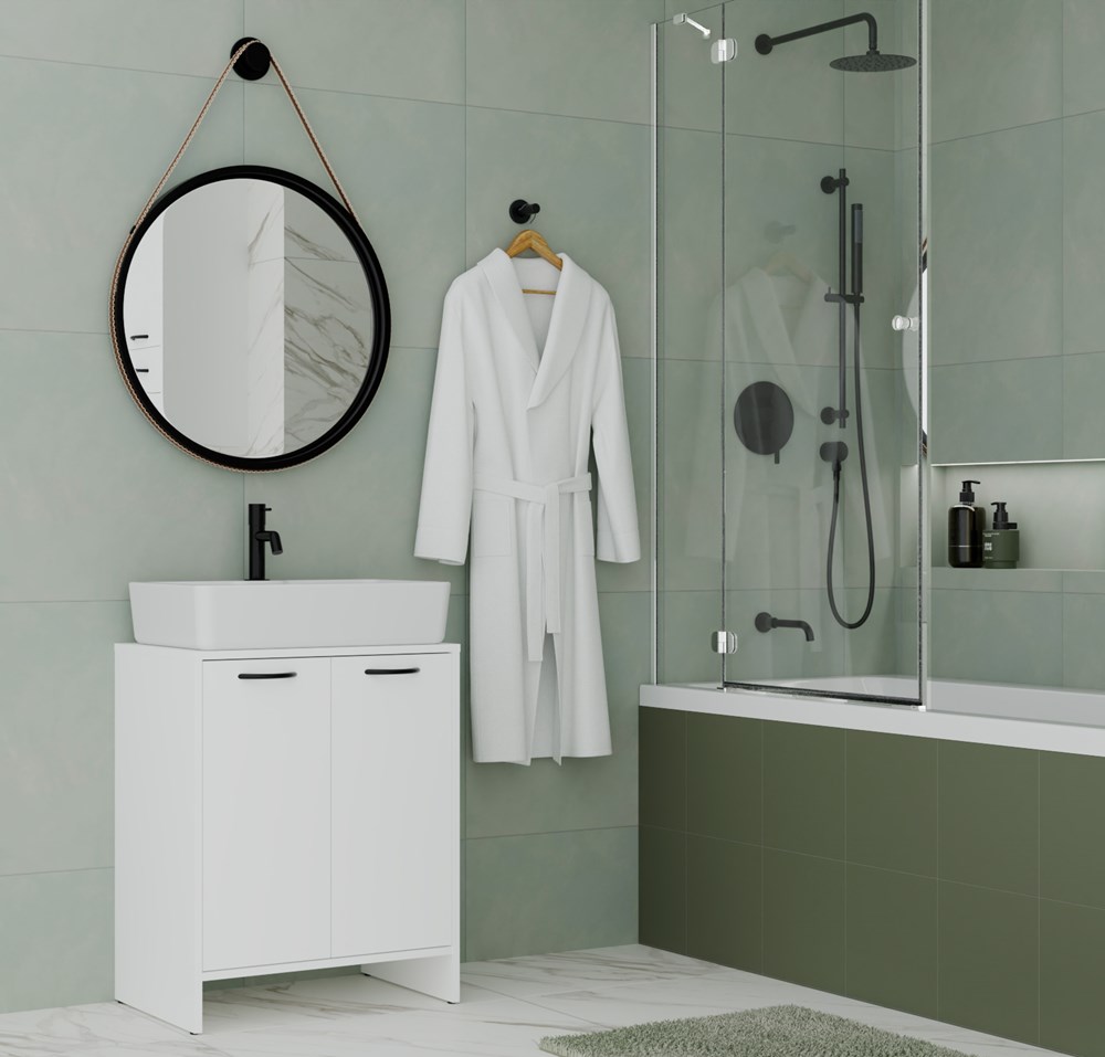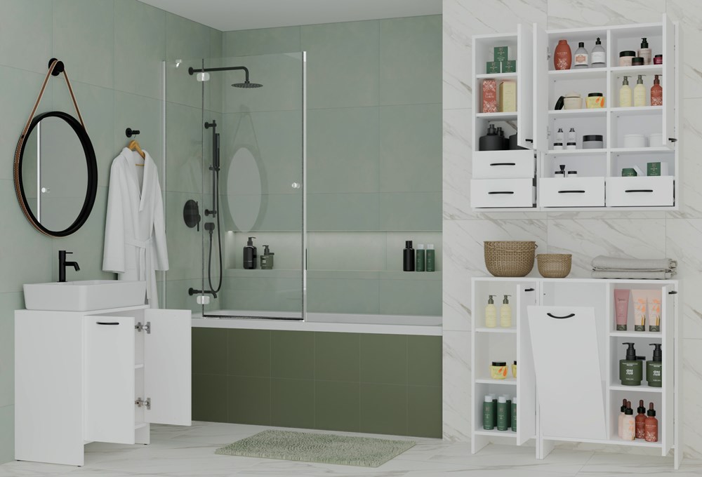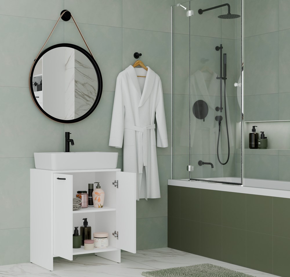 - Dwoje drzwi – kryją praktyczne wnętrze z 2 półkami na środki czystości, kosmetyki lub inne akcesoria
