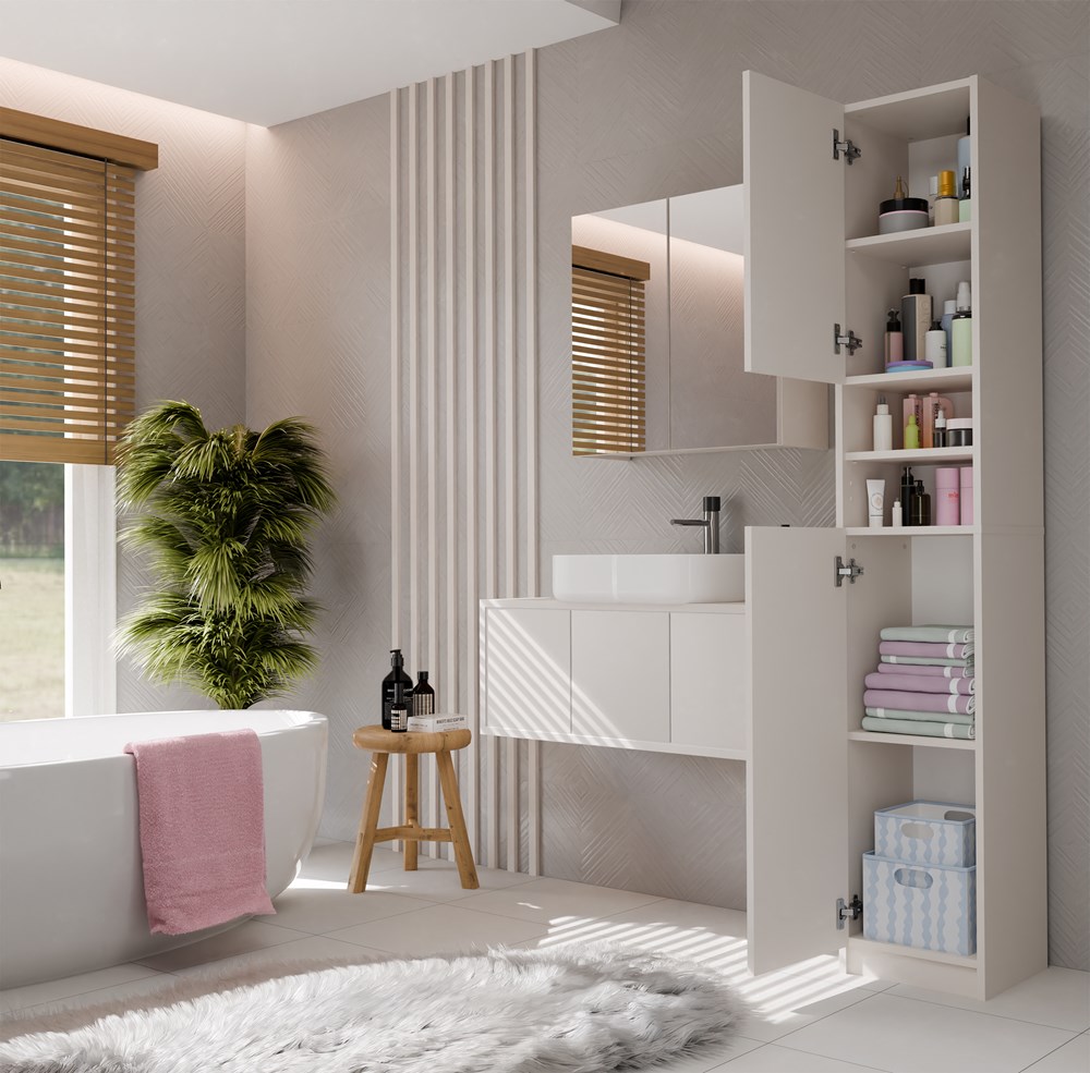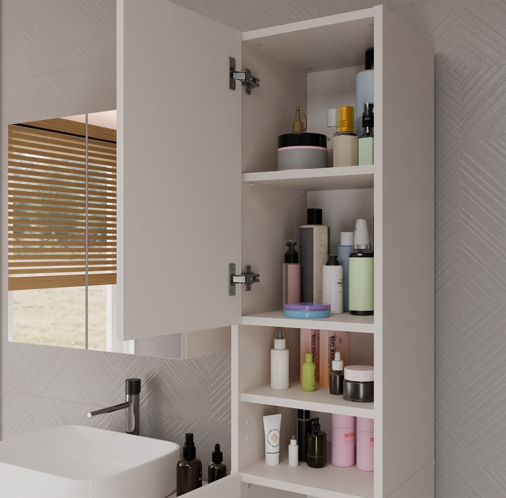 Szafka łazienkowa MARBELA 1.0 to praktyczne i eleganckie rozwiązanie, które pozwala zachować porządek nawet w niewielkich przestrzeniach. Smukła forma, nowoczesne wykończenie w kolorze Kaszmir oraz minimalistyczne czarne uchwyty sprawiają, że mebel świetnie wpisuje się w estetykę współczesnych łazienek – zarówno tych jasnych, jak i bardziej wyrazistych.