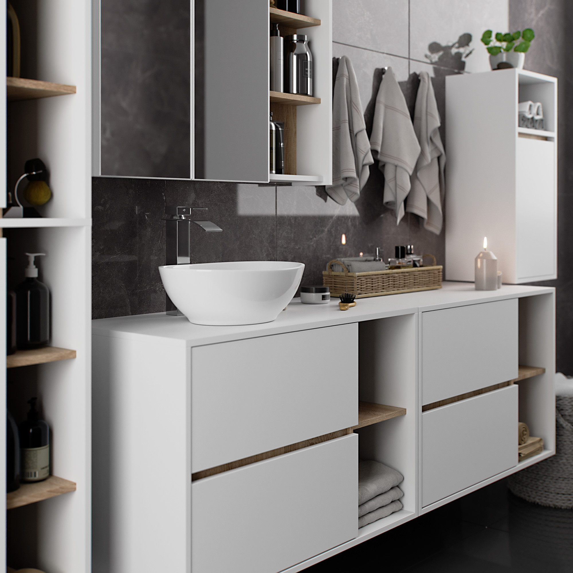 Szafki łazienkowe świetnie uzupełniają wyposażenie łazienki, zapewniając niezbędne miejsce na wszelkie kosmetyki i detergenty oraz nadając łazience określony styl. Pojemne szafki ułatwiają zachowanie porządku w pomieszczeniu, co korzystnie wpływa na estetykę wnętrza. Kolekcja VAMI wyróżnia się przykuwającą uwagę stylową kolorystyką – korpus oraz fronty mają taką samą barwę, natomiast kolor wewnętrzny jest inny.